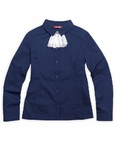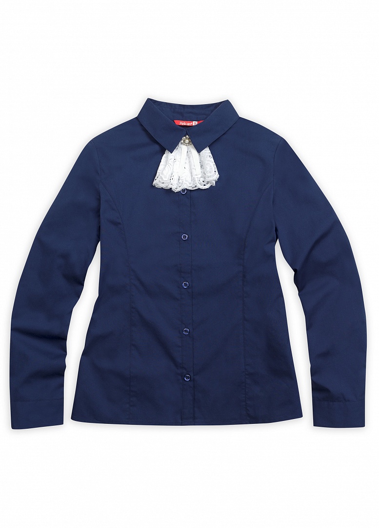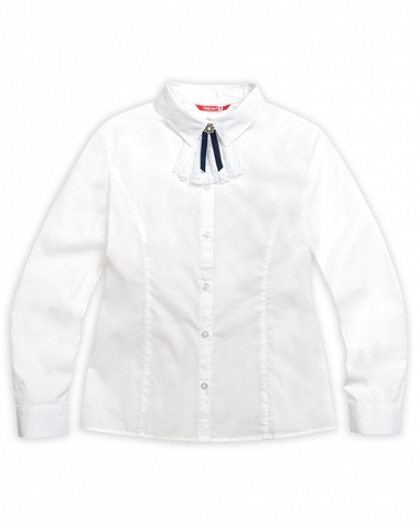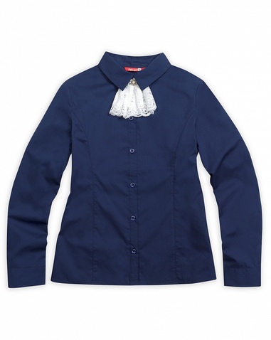 Блузка для девочек. Классическая блузка с длинным рукавом на манжете, воротник с острыми уголками. Область воротника декорирована съёмным жабо из роскошного кружева, задрапированного в пышные складки, с маленьким бантиком из бархатной тесьмы и декоративной пуговицей. Коллекция - школа. Состав: 60%хлопок 40%полиэстер