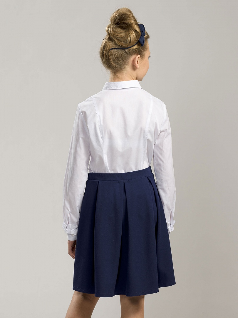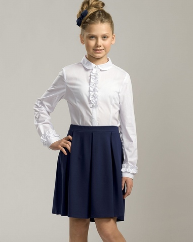 Классическая блузка. Рукав на широкой манжете с застежкой и маленький воротничок с закругленными концами придают блузке строгость. Рюша настрочена вдоль супатной застежки и вдоль верхнего края манжеты рукава. Жемчужные пуговицы. Состав: 60%хлопок 40%полиэстер