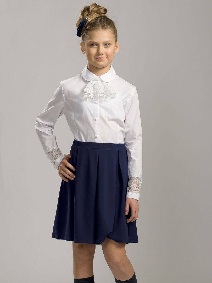 Классическая блузка. По низу рукава расположена вставка из кружева с узкой изящной манжетой. Съёмный декоративный элемент в виде жабо из кружева в два слоя и бархатного бантика белого цвета. Состав: 60%хлопок 40%полиэстер, вставка: 100%полиэстер