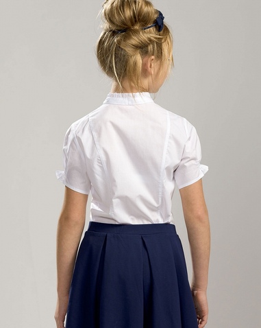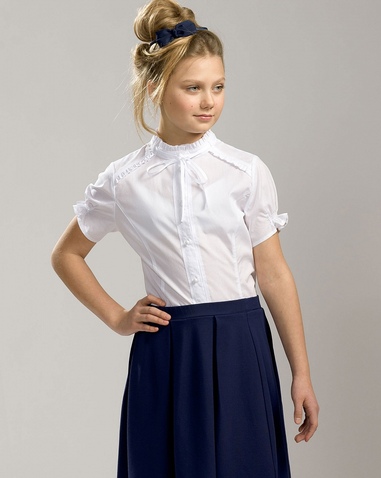 Классическая блузка с коротким рукавом. Аккуратные узкие рюши украшают воротник-стойку, верхние края манжет рукавов и шов притачивания кокетки переда. Узкая репсовая лента вдоль планки по переду и по воротнику придает особую изысканность модели. Новый короткий рукав: его низ собран на шпульную резину, которая современно и по-новому формирует рукав типа «фонарик». Состав: 60%хлопок 40%полиэстер