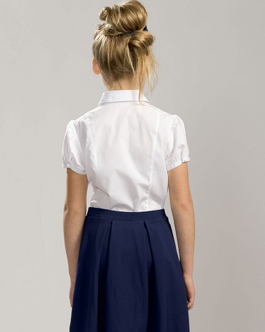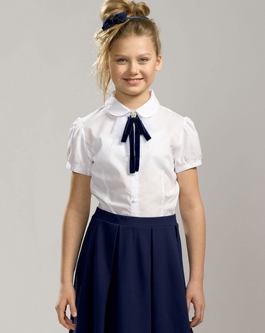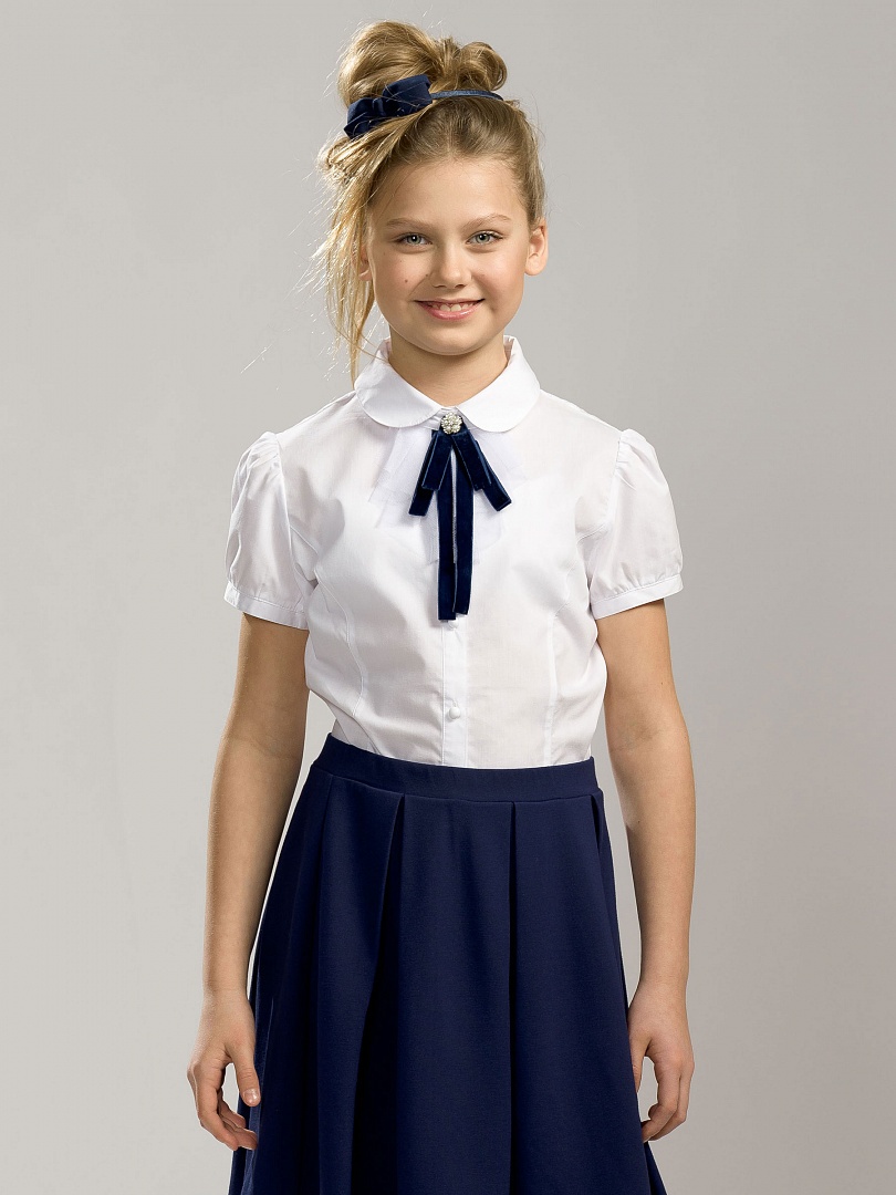 Классическая блузка с коротким рукавом. Съёмный декоративный элемент в виде нежного жабо из сетки с настроченной бархатной тесьмой, имитирующей завязанный бантик. По центру — декоративная брошка. Рукав застёгивается на пуговицу. Состав: 60%хлопок 40% полиэстер, вставка: 100%полиэстер