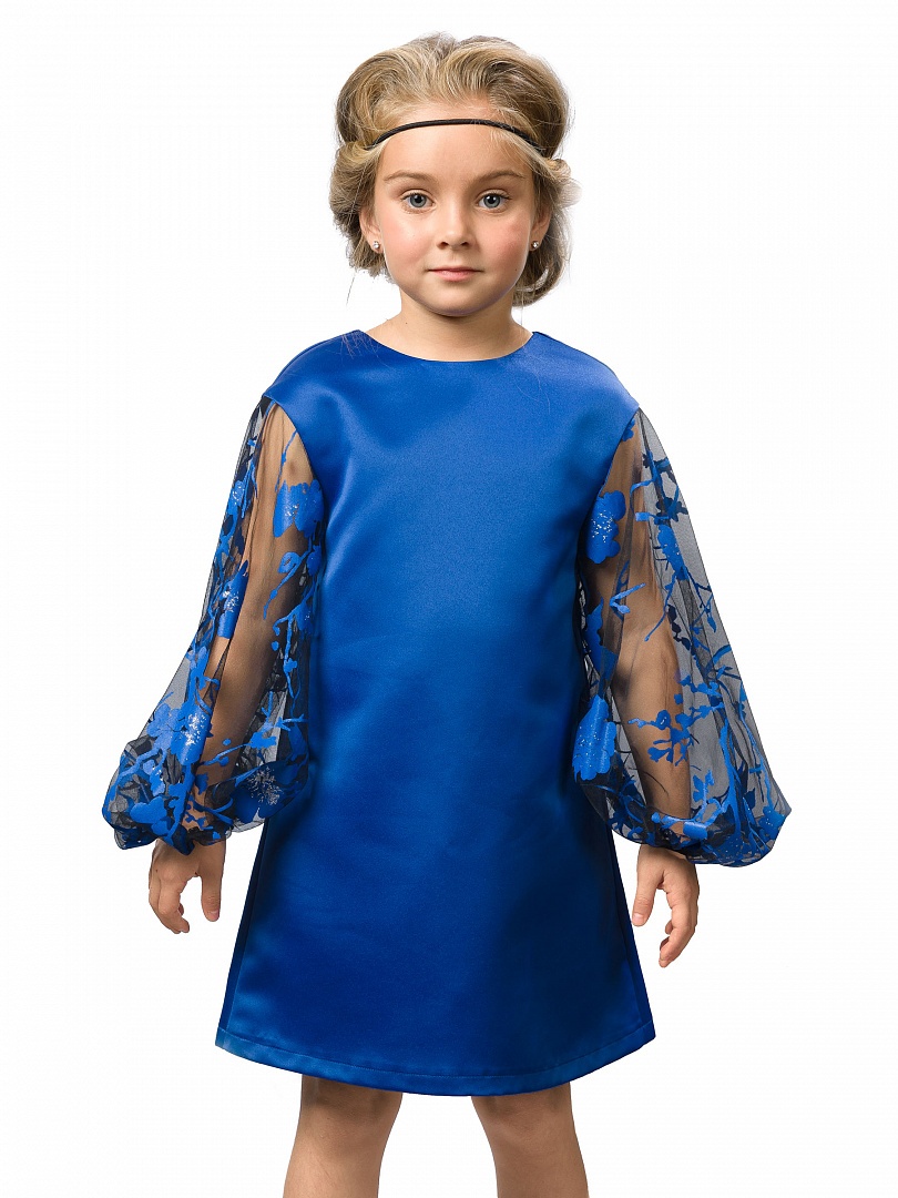 Платье для девочек. Платье А-силуэта из плотной ткани с сатиновым блеском, хлопчатобумажная подкладка. Слегка спущенная линия плеча. Фишка изделия! Объёмные и лёгкие рукава фантазийной формы из декоративной сетки с цветочным принтом с серебряным блеском. По низу рукавов эластичная тесьма. Для комфорта в носке внутренняя окантовка проймы выполнена из хлопка. Застёжка по спинке на потайную молнию. Состав: 100%полиэстер, вставка: 100%нейлон, подклад: 100%хлопок