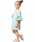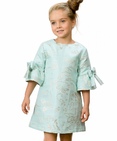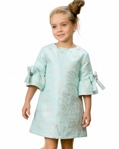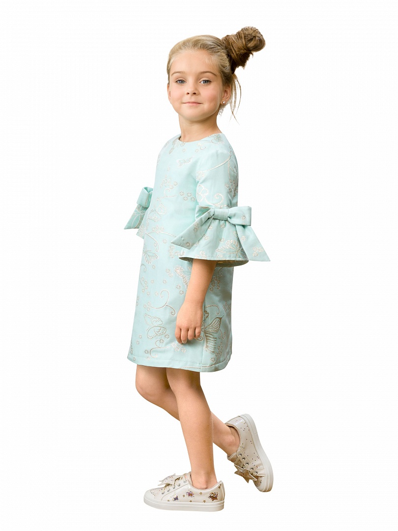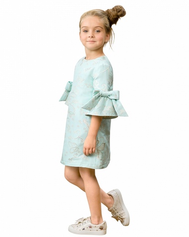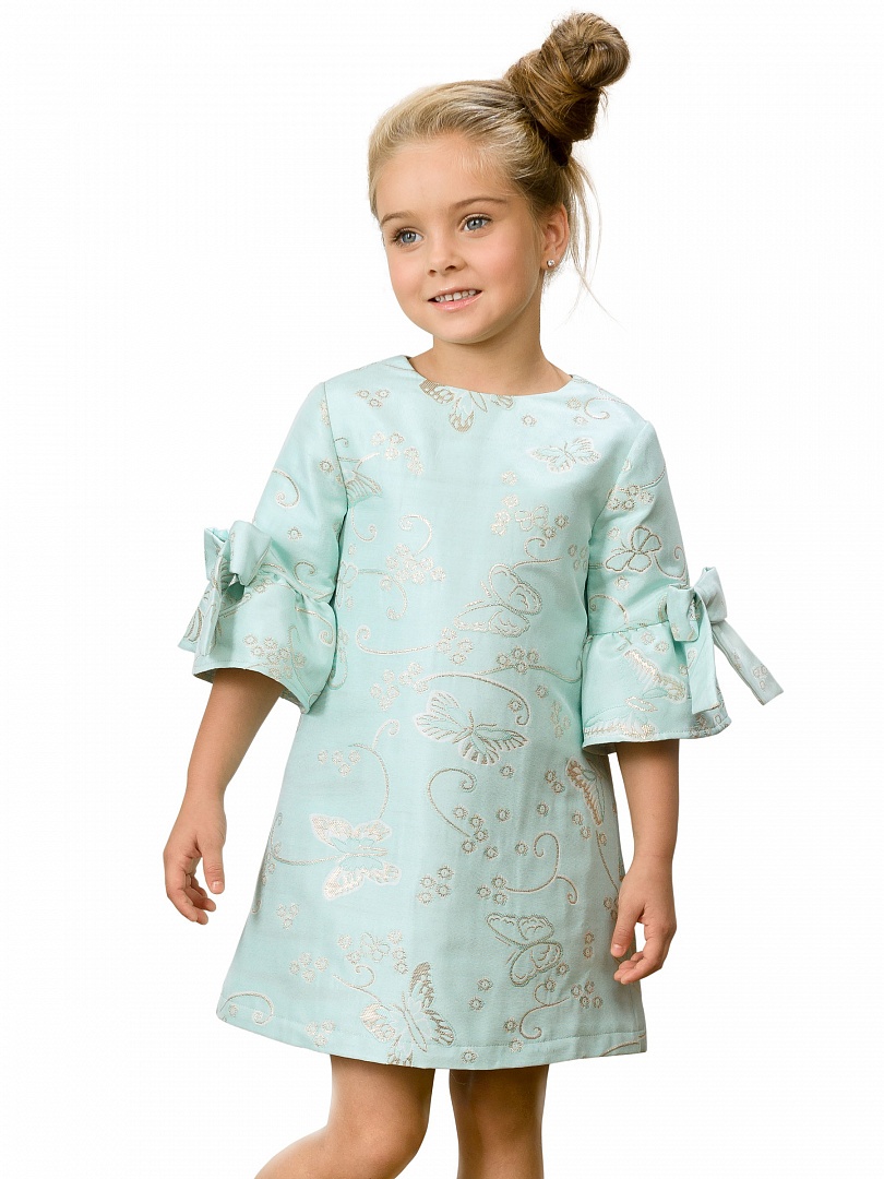 Платье для девочек. Платье трапециевидного силуэта. Нарядная жаккардовая ткань мятного цвета с вытканными бабочками с мерцающим золотом, хлопчатобумажная подкладка. Втачной рукав длиной 3/4 с притачным воланом, декорирован объёмными бантами. Застёжка по спинке на потайную молнию. Состав: 100%полиэстер, подклад: 100%хлопок