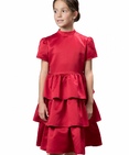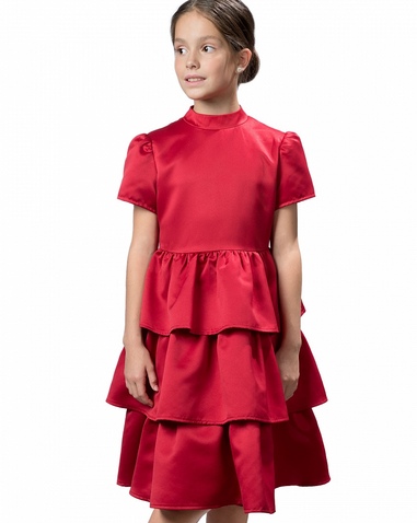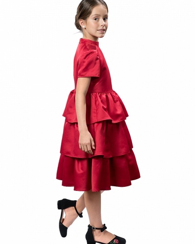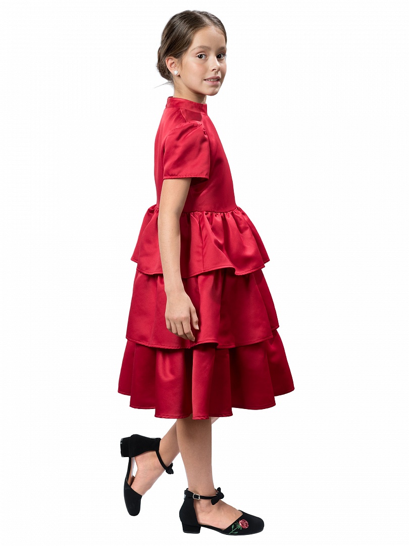 Платье для девочек. Платье средней длины из новой плотной формоустойчивой ткани с благородным сатиновым блеском, хлопчатобумажная подкладка. Узкий воротник-стойка, рукава с небольшой сборкой по окату, завышенная линия талии, юбка состоит из трёх объёмных воланов. Застёжка по спинке на потайную молнию. Состав: 100%полиэстер, подклад: 100%хлопок