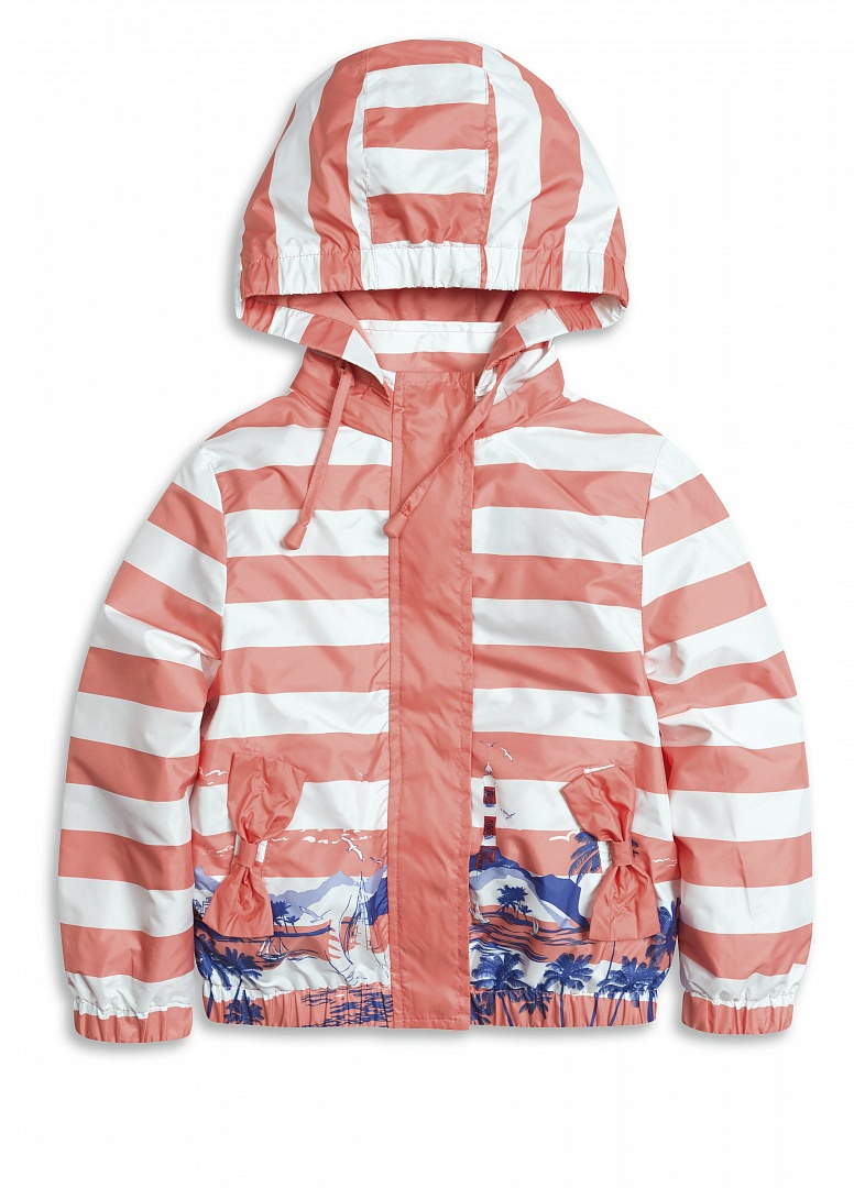 ткань верха с водоотталкивающей пропиткой, внизу изделия расположен купонный принт, карманы декорированы бантами. В состав ткани для подклада входит хлопок, что позволяет увеличить линейку для потребителя с 2-х лет и старше. Состав: 100%полиэстер, подклад: 65%полиэстер 35%хлопок, подклад рукавов: 100%полиэстер