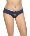 Женские трусики-шортики. Средняя посадка. Центральный серебристый принт со стразами. По талии серебристый эластик, декорированный атласным бантиком с люрексом. По ноге обработка эластиком сверху. Состав: 93%хлопок 7%эластан