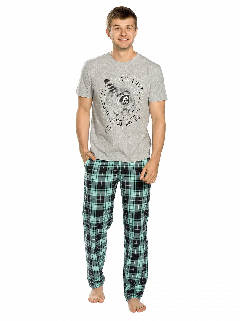 Комплект мужской: футболка и брюки. На рост 176 см. Футболка прямого силуэта, среднего объёма. Центральный принт в виде шкодного енота и надпись игра слов "I`m enot you are not :)". Детали принта флуоресцентные и светятся в темноте. Брюки прямого силуэта из фланели, карманы в боковых швах, регулировка объема по талии шнурком. Состав: верх: 95%хлопок 5%эластан, низ: 100%хлопок