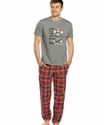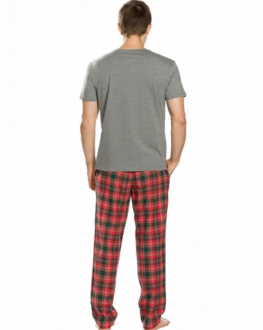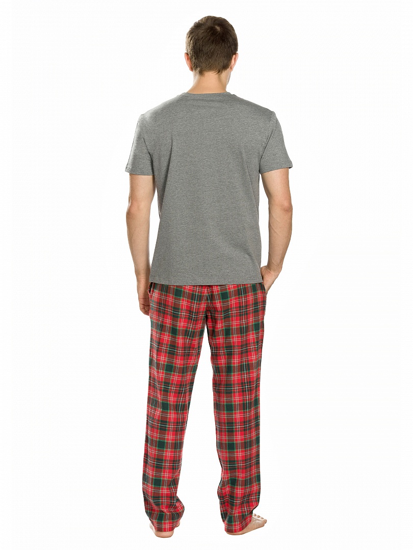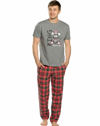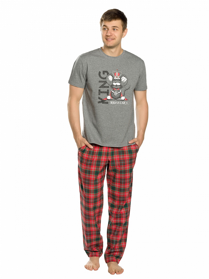 Комплект мужской: футболка и брюки. На рост 176 см. Футболка прямого кроя, среднего объёма. Центральный принт с серебром в виде мышонка короля и надпись "Люби и кайся". Брюки прямого силуэта из фланели на широкой резинке с карманами в боковых швах. Состав: верх: 100%хлопок, низ: 100%хлопок