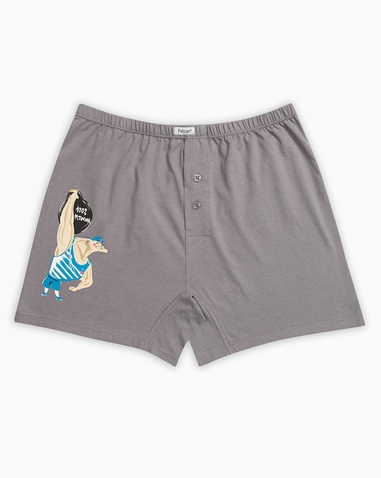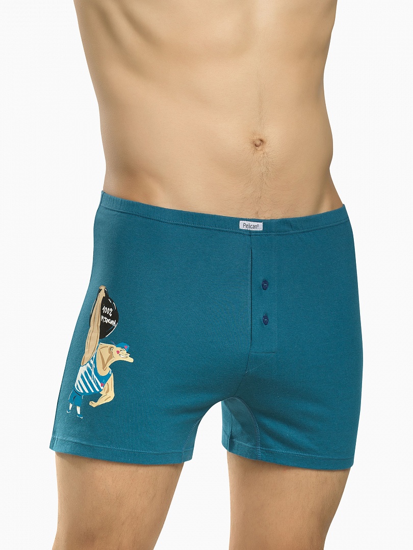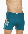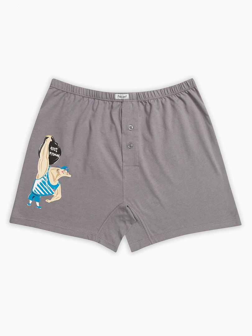 Мужские трусы-боксеры. Принт на боковой части изделия: моряк-силач и надпись "100% мужик".Гульфик на пуговицах на передней части изделия. Состав: 100%хлопок