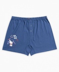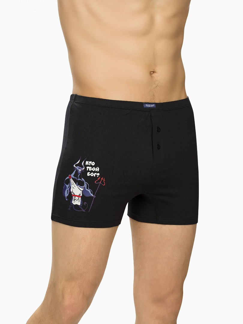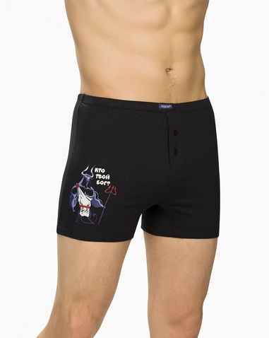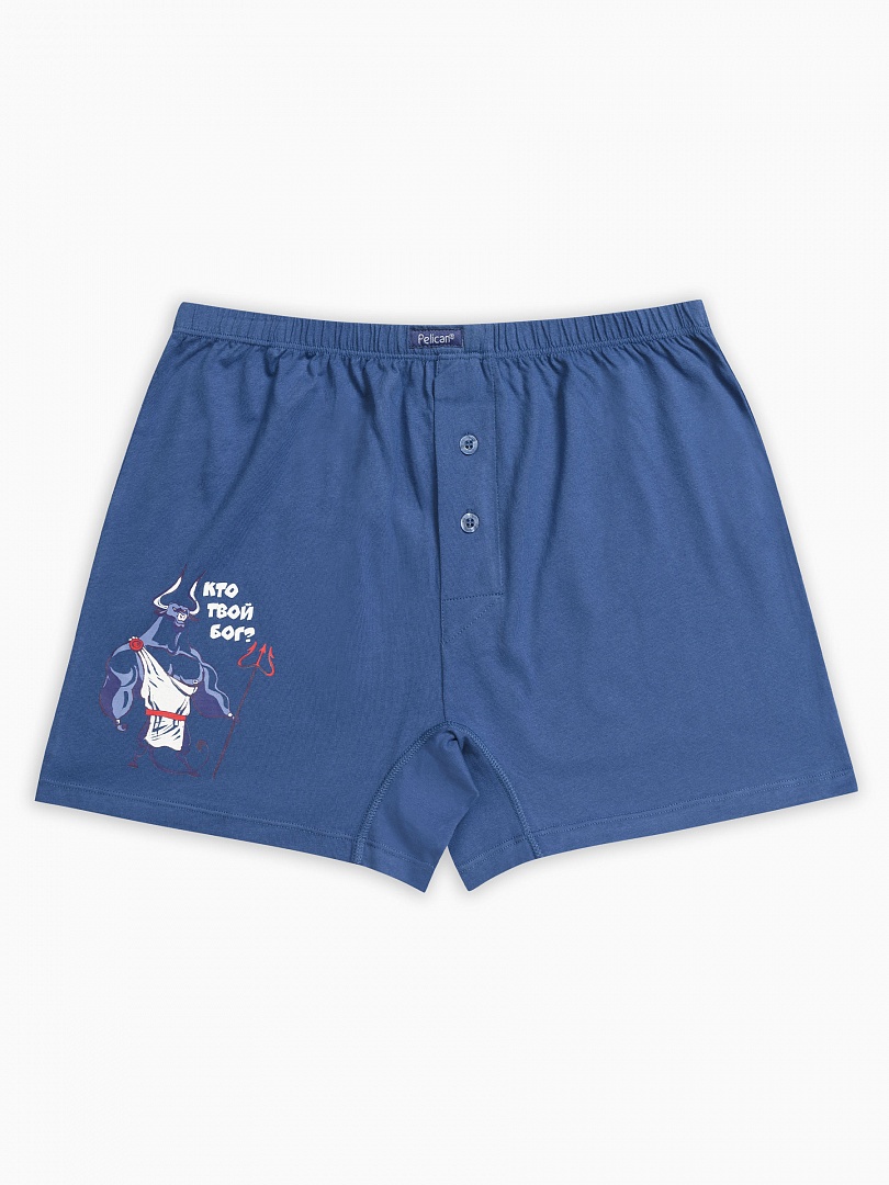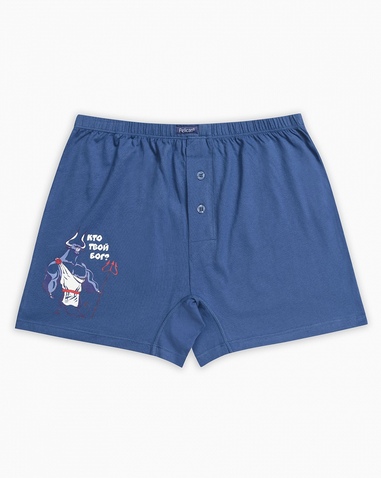 Мужские трусы-боксеры. На боковой части изделия прикольный принт: бык в тоге и надпись "Кто твой бог?". Гульфик на двух пуговицах. Состав: 100%хлопок