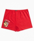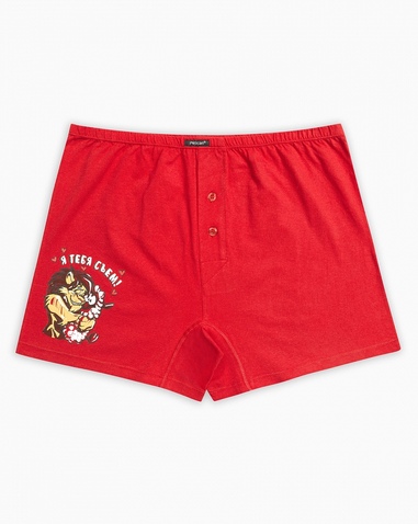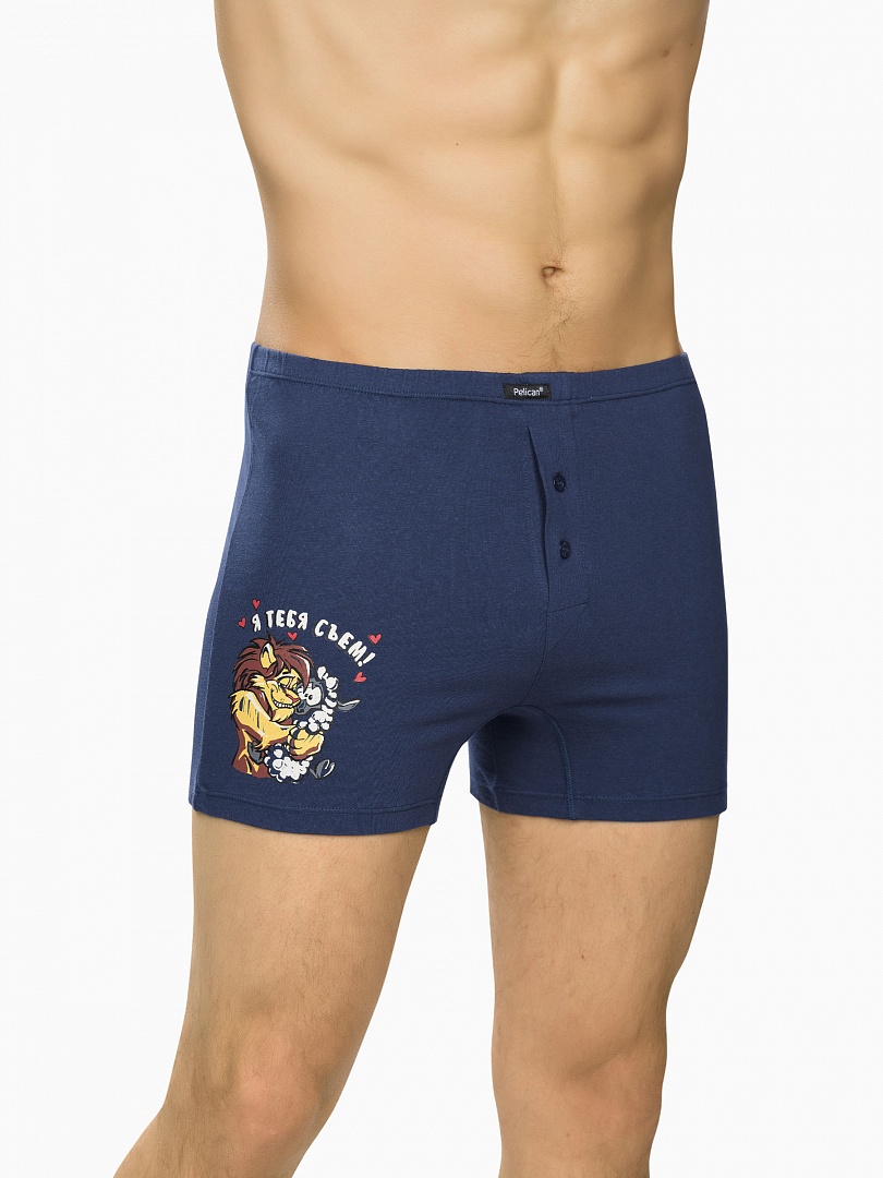 Мужские трусы-боксеры. На боковой части изделия прикольный принт: влюблённый лев, обнимающий овцу, и надпись "Я тебя съем". Гульфик на двух пуговицах. Состав: 100%хлопок