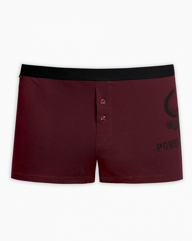 Мужские трусы-боксеры в спортивном стиле. Принт на боковой части изделия: голова быка и надпись "Power" (пер. "Сила").Гульфик на пуговицах на передней части изделия. Состав: 100%хлопок