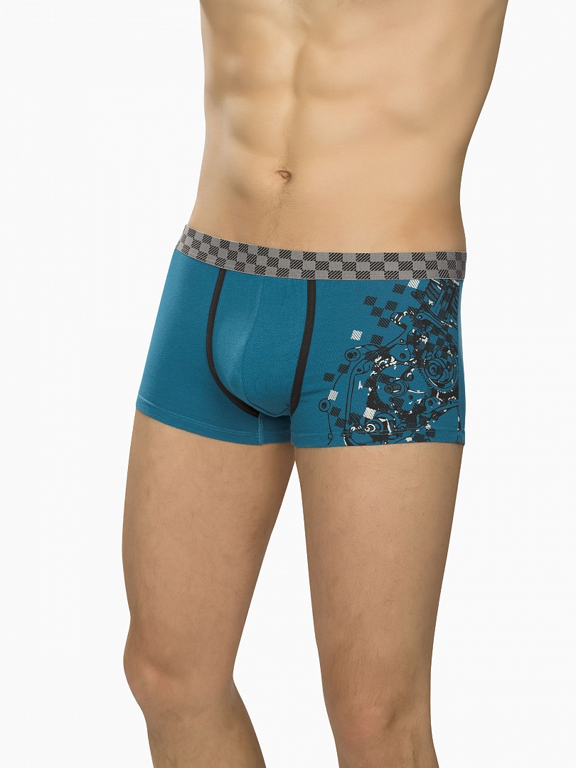 Мужские трусы-шорты в спортивном стиле. Низкая посадка. Декоративная отстрочка из пайпинга в области гульфика. По талии широкая тканая резинка в два цвета (узор "шашечки"). Состав: 93%хлопок 7%эластан