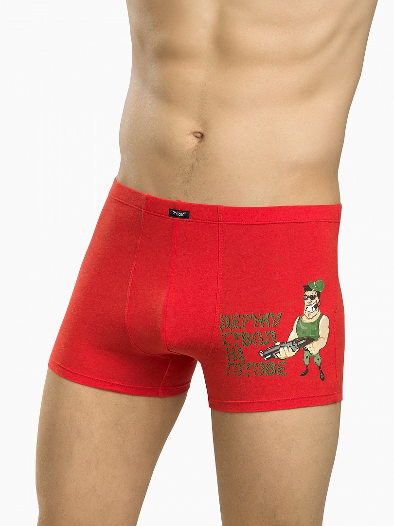 Мужские трусы-шорты. Средняя посадка. Принт на боковой части изделия: спецназовец с ружьём и надпись "Держу ствол наготове". Состав: 93%хлопок 7%эластан