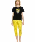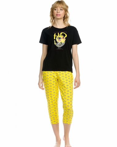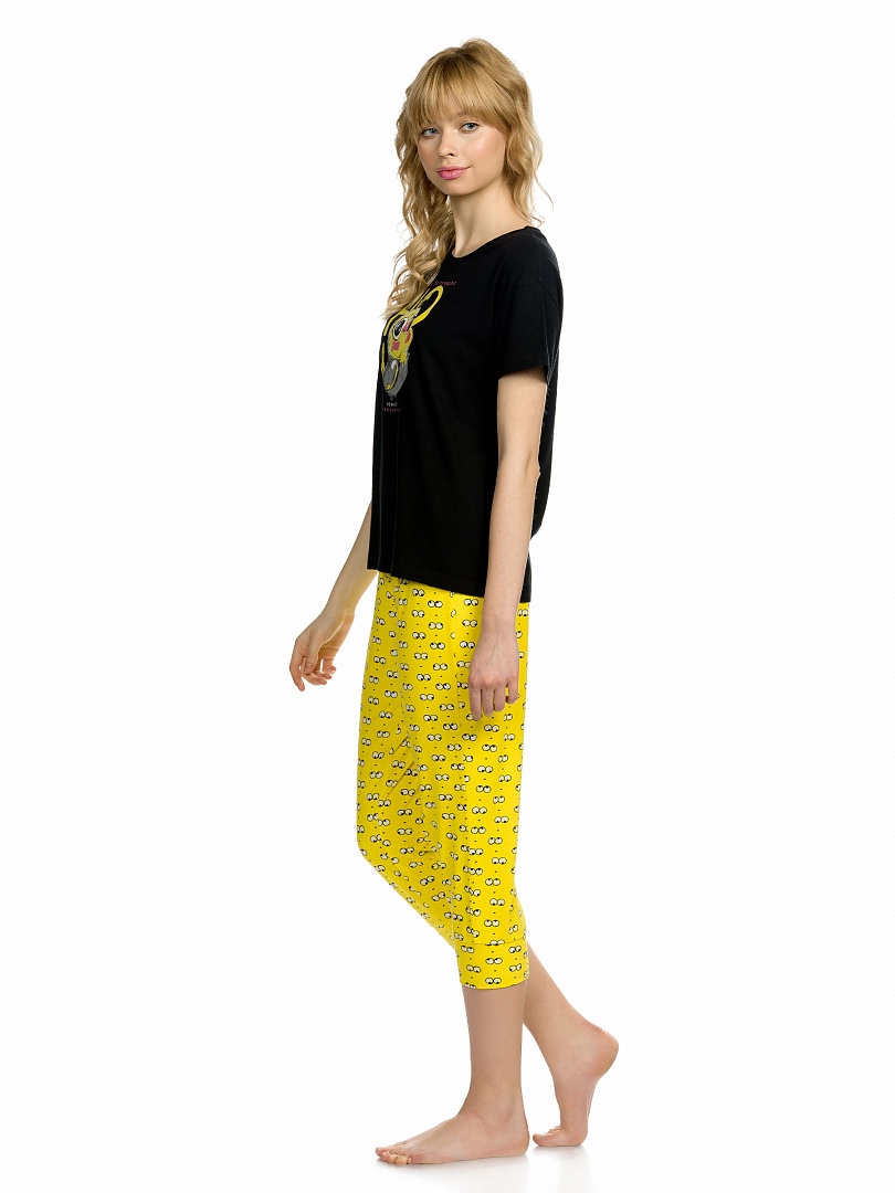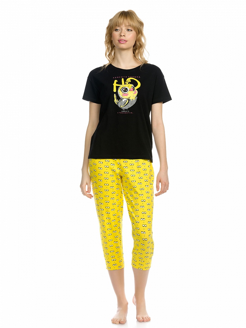 Комплект женский: футболка и бриджи. Футболка прямого кроя среднего объема. Суперстойкий, эластичный принт. Бриджи комфортного объема с мягким и стойким soft-принтом. По талии - на плоской широкой резинке, по низу - манжеты шириной 7 см. Состав: верх: 92%хлопок 8%эластан, низ: 92%хлопок 8%эластан