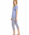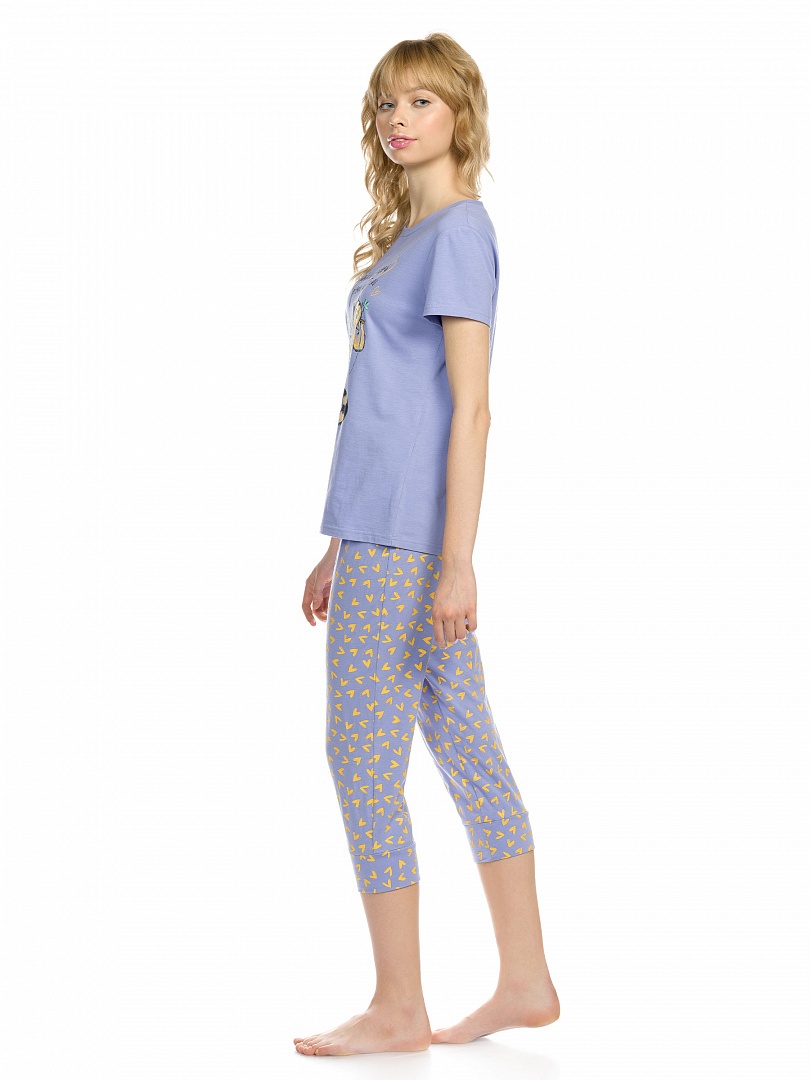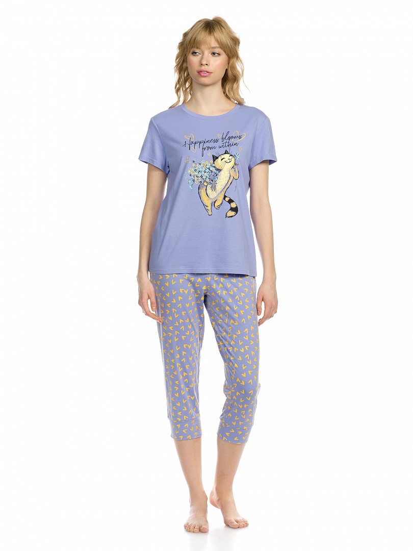 Комплект женский: футболка и бриджи. Футболка прямого кроя среднего объема. Суперстойкий и эластичный принт. Перевод: "Счастье расцветает изнутри". Бриджи комфортного объема. По талии - на плоской широкой резинке, по низу - манжеты шириной 7 см. Состав: верх: 57%хлопок 38%полиэстер 5%эластан, низ: 57%хлопок 38%полиэстер 5%эластан