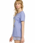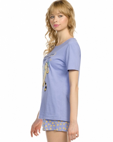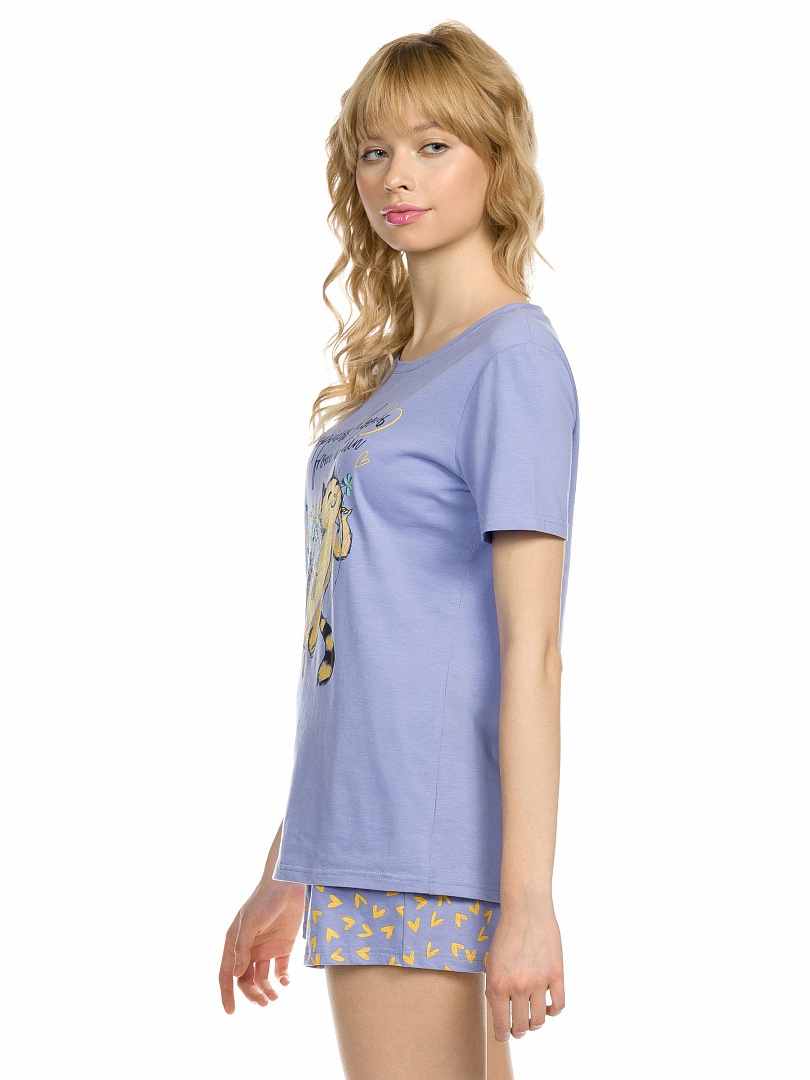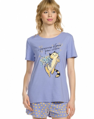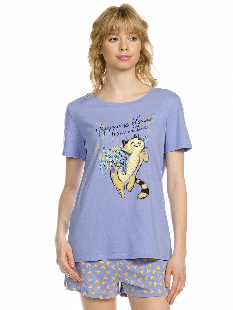Комплект женский: футболка и шорты. Футболка свободного объема, спущенное плечо. Суперстойкий и эластичный принт. Перевод: "Счастье расцветает изнутри". Шорты умеренного объема. По талии - на комфортной резинке. Состав: верх: 57%хлопок 38%полиэстер 5%эластан, низ: 57%хлопок 38%полиэстер 5%эластан