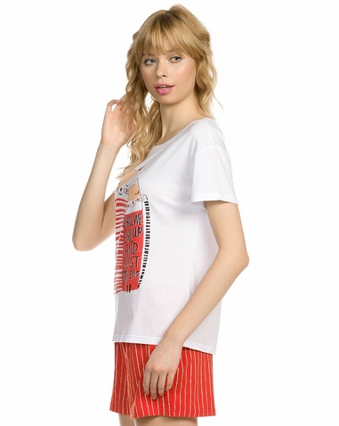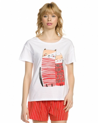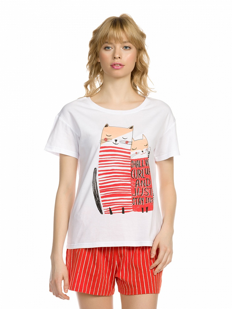 Комплект женский: футболка и шорты. Футболка увеличенного объема, спущенное плечо. Мягкий стойкий soft-принт. Перевод: "Может, свернемся калачиком и останемся дома?". Шорты среднего объема, в тонкую полоску, как бы выполненную штрихами (суперпрочный эластичный принт). Состав: верх: 57%хлопок 38%полиэстер 5%эластан, низ: 65%полиэстер 30%хлопок 5%эластан