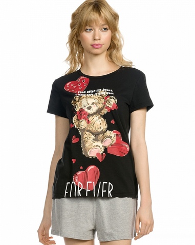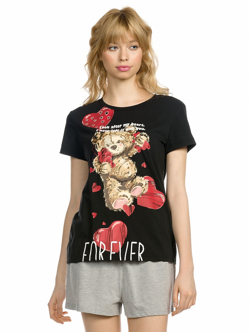 Комплект женский: футболка и шорты. Футболка прямого кроя среднего объема. Суперстойкий эластичный принт. Перевод: "Заботься о моем сердце. Я оставляю его тебе. Навсегда". Шорты умеренного объема из меланжа, на комфортной внутренней резинке. Состав: верх: 57%хлопок 38%полиэстер 5%эластан, низ: 60%хлопок 40%полиэстер