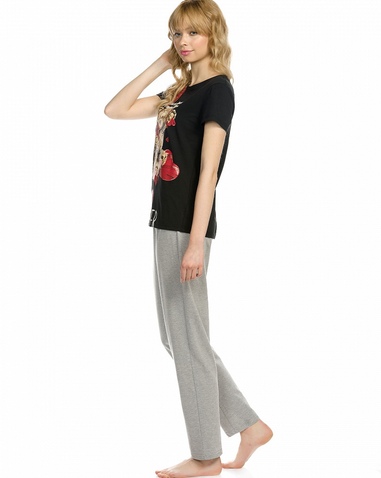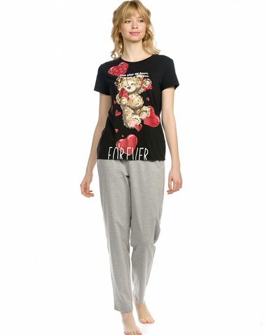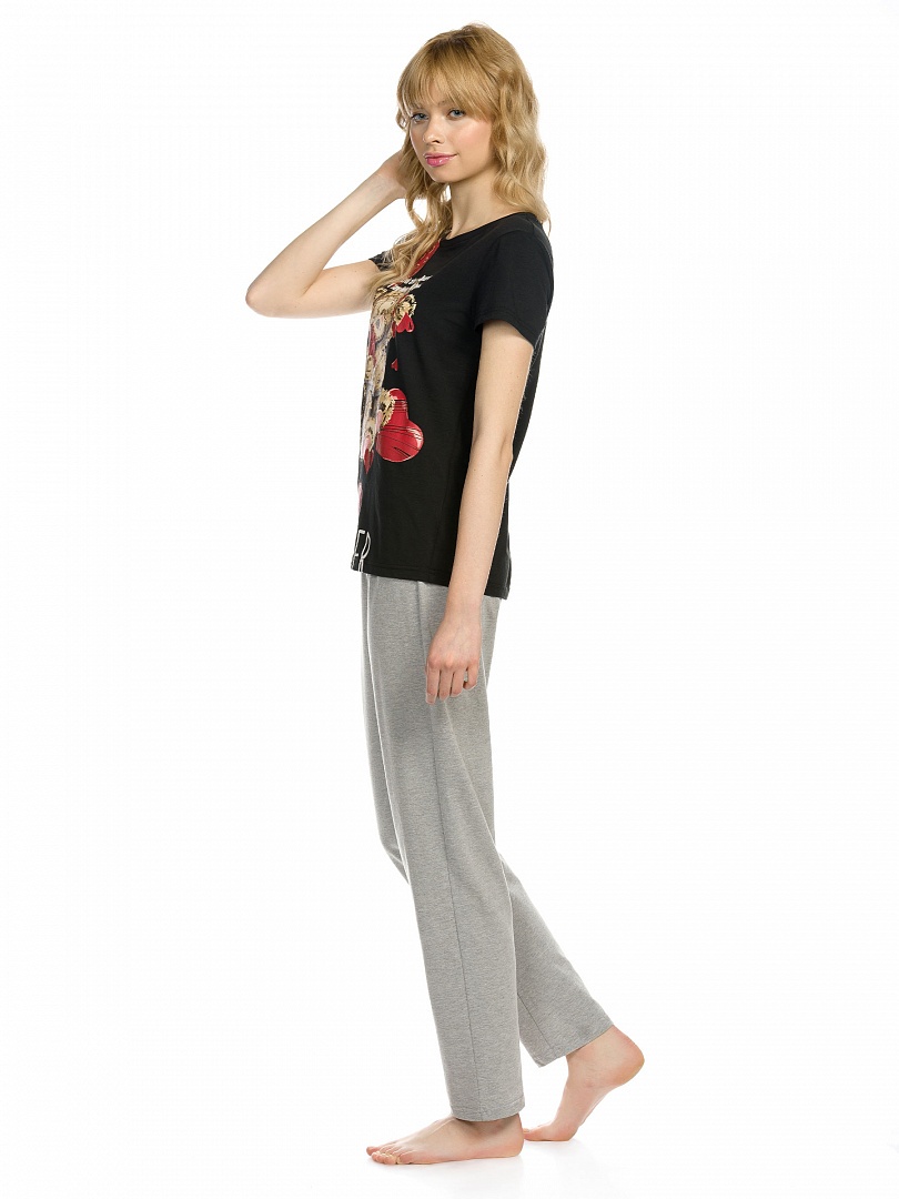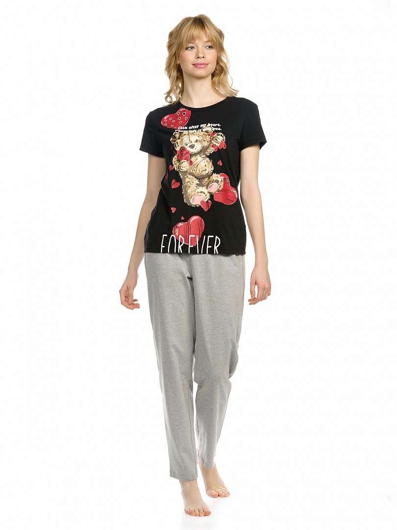 Комплект женский: футболка и брюки. Футболка прямого кроя среднего объема. Суперстойкий эластичный принт. Перевод: "Заботься о моем сердце. Я оставляю его тебе. Навсегда". Брюки умеренного объема из меланжа, на комфортной внутренней резинке. Состав: верх: 57%хлопок 38%полиэстер 5%эластан, низ: 60%хлопок 40%полиэстер