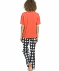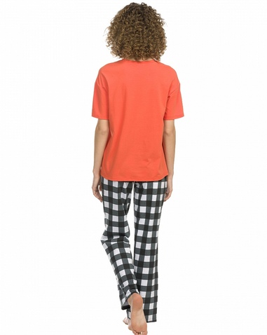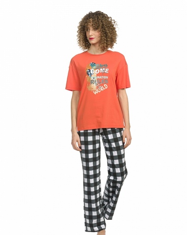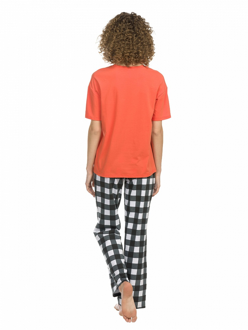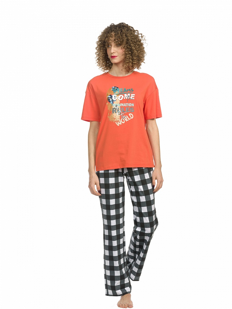Комплект женский: футболка и брюки. Футболка слегка увеличенного объема, спущенное плечо, широкий рукав. Моно-принт с металлизированными оттенками разных цветов. Перевод: "Мечты сбываются. Воображение правит миром". Рисунок клетки имитирует фактуру ткани. Брюки умеренного объема с карманами в боковых швах. Состав: верх: 57%хлопок 38%полиэстер 5%эластан, низ: 57%хлопок 38%полиэстер 5%эластан