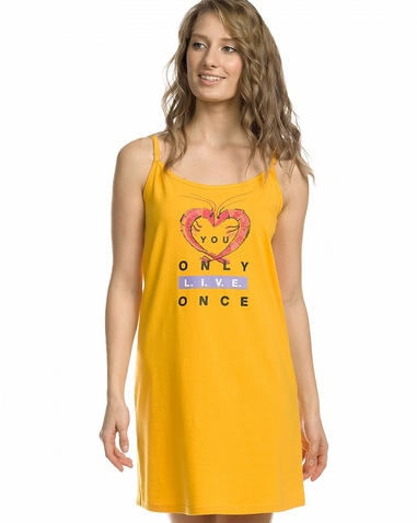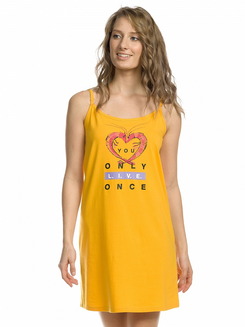 Платье женское. Платье на регулируемых бретелях расслабленного А-силуэта. Суперстойкий эластичный принт. Перевод: "Ты живешь только однажды". Состав: 57%хлопок 38%полиэстер 5%эластан