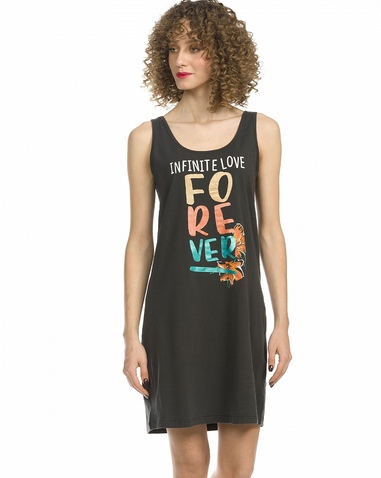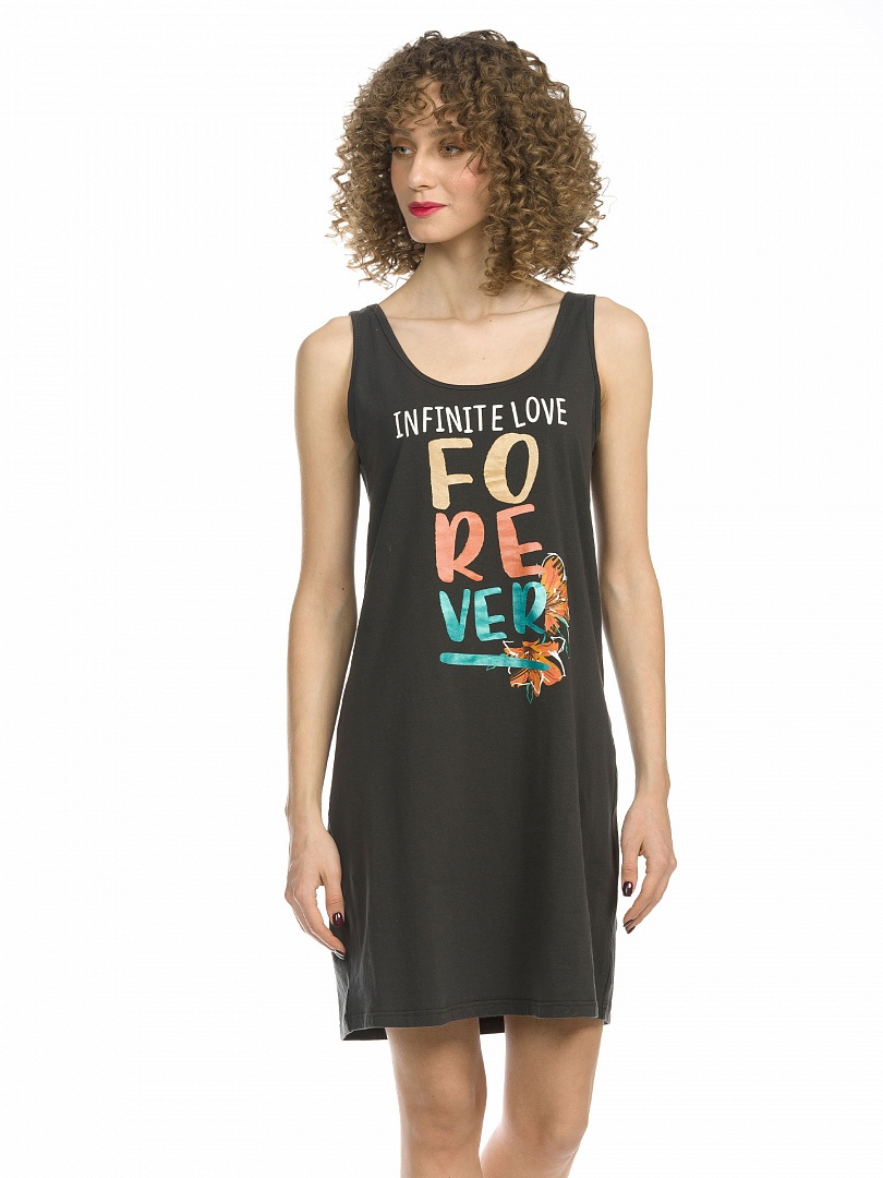 Платье женское. Сорочка на широких бретелях - легкое расклешение книзу, углубленные вырезы горловины впереди и на спинке. Металлизированный принт разных оттенков. Перевод: "Бесконечная любовь навсегда". Состав: 95%хлопок 5%эластан