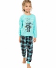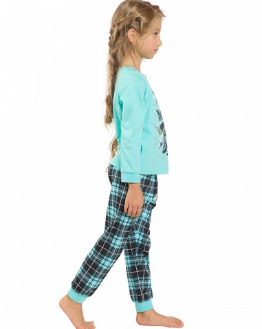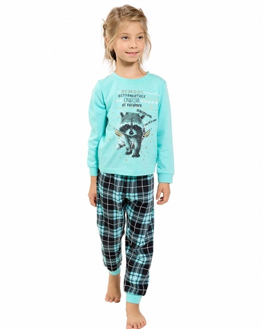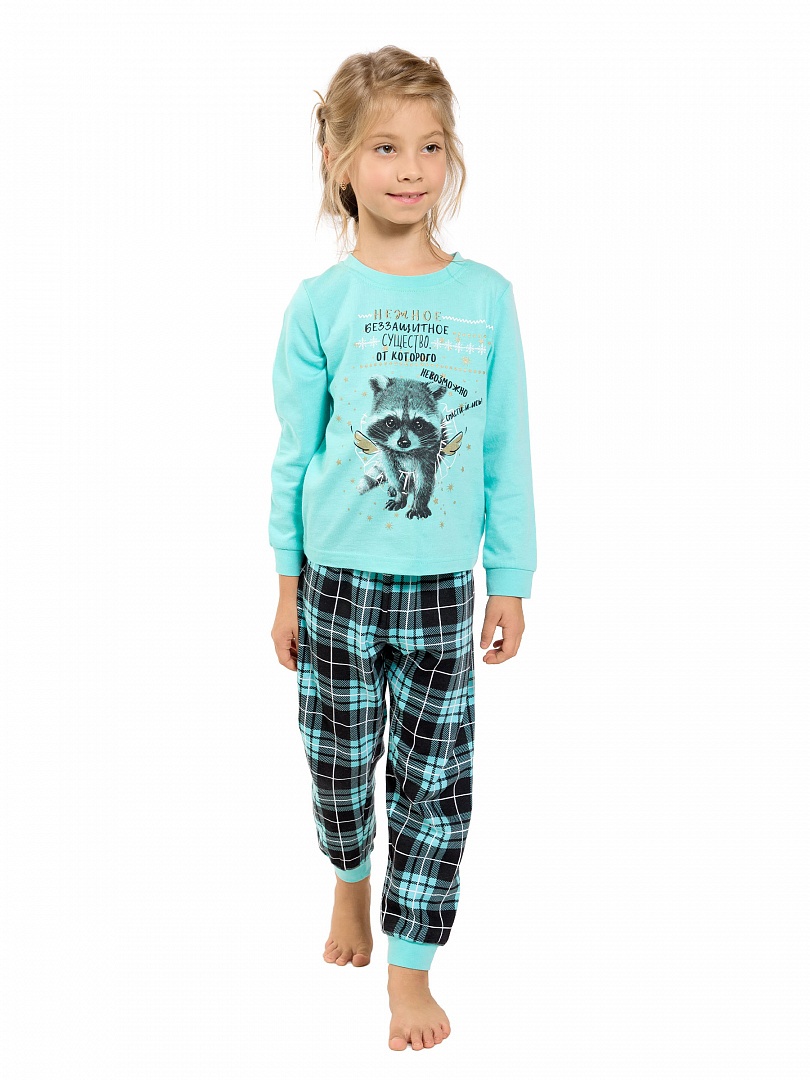 Пижама для девочек: джемпер и брюки. Джемпер модного ментолового цвета. Центральный принт с использованием золота и золотого металлика в виде балдёжного енота и надпись "Нежное беззащитное существо, от которого невозможно спастись!". Отделка горловины и манжеты выполнены из рибаны. Брюки в ментоловую клетку. По низу брючин манжеты из рибаны. Состав: верх: 100%хлопок, низ: 100%хлопок