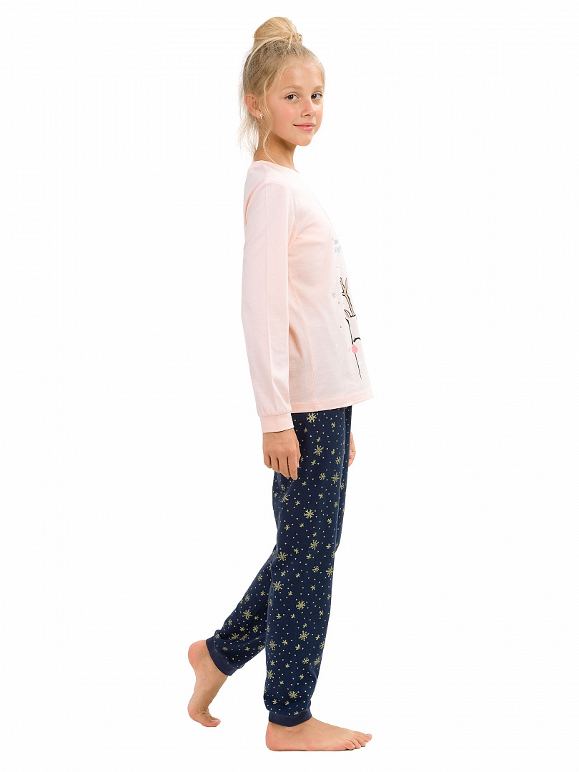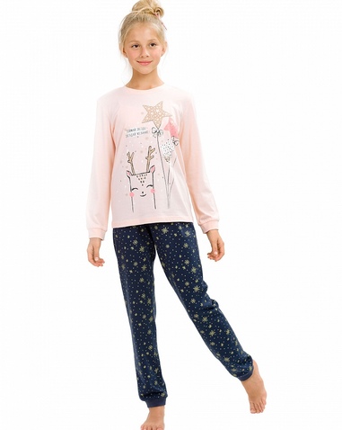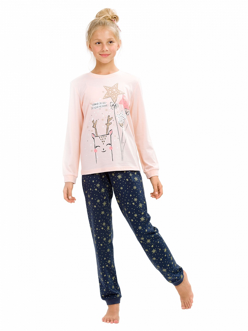 Пижама для девочек: джемпер и брюки. Джемпер нежного розового цвета. Центральный принт выполнен в необычной стилизованной графике, которую дополняет обилие золота. Надпись "Поймай звезду - загадай желание!" напоминает нам о новогодней сказке. Отделка горловины и манжеты выполнены из рибаны. Тёмно-серые брюки запринтованы золотыми снежинками. По низу брючин манжеты из рибаны. Состав: верх: 100%хлопок, низ: 100%хлопок