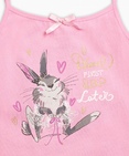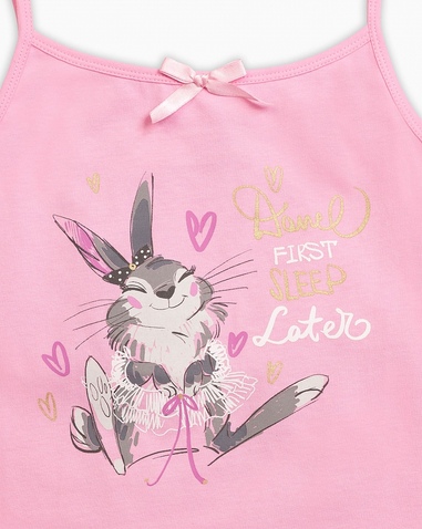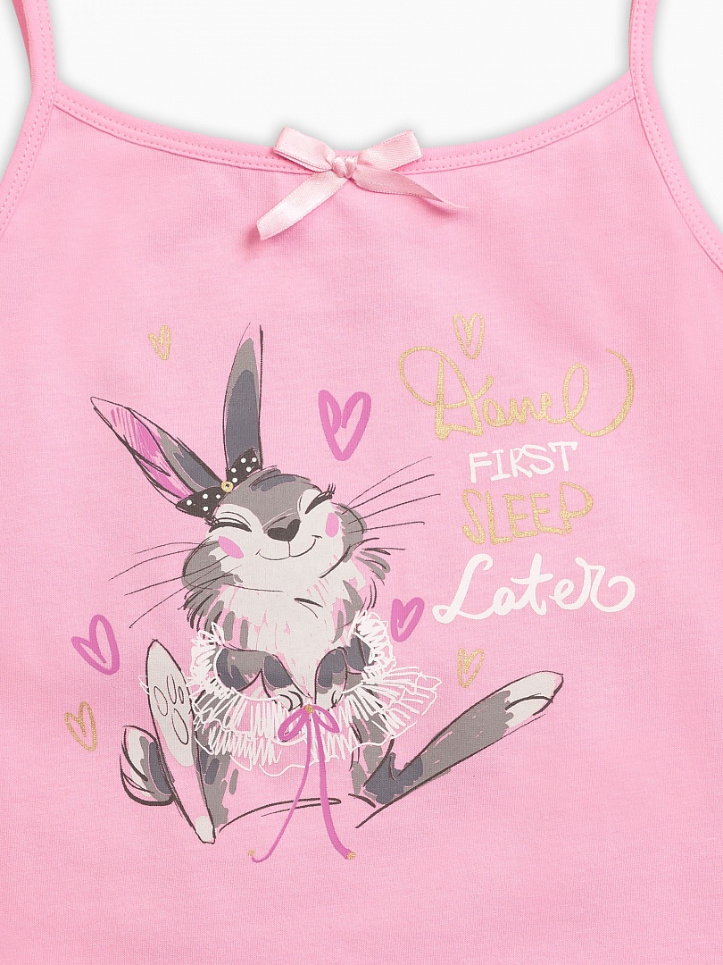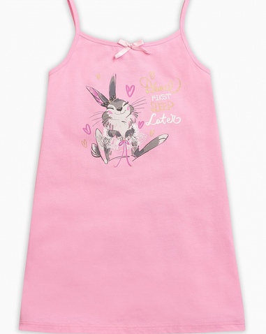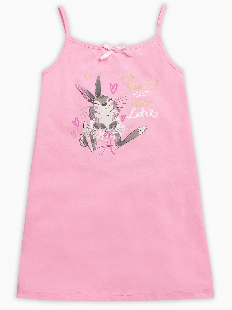 Ночная сорочка для девочек. Сорочка выполнена в розовом цвете, горловина декорирована изящным бантиком. Центральный принт с золотом - зайка-балеринка и надпись (перевод) "Сначала потанцуем, поспим позже". Состав: 100%хлопок