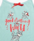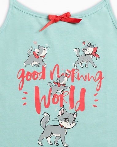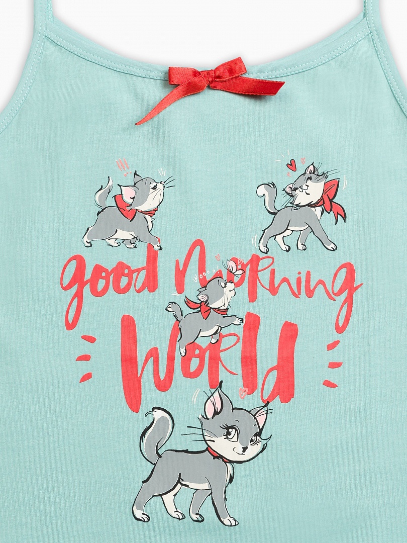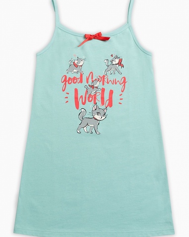 Ночная сорочка для девочек. Сорочка выполнена в лазурном цвете, горловина декорирована изящным бантиком. Центральный принт - жизнерадостные кошечки и надпись (перевод) "Доброе утро, мир!". Состав: 100%хлопок