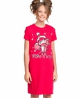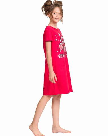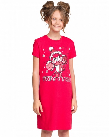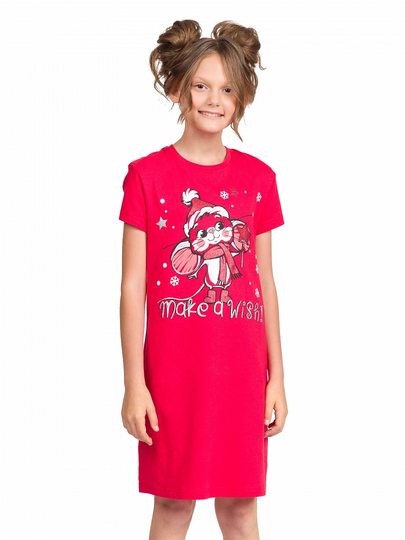 Ночная сорочка для девочек. Платье с коротким рукавом, свободный силуэт. Центральный принт с красным глиттером и фольгированным серебром в виде символа года - мышки. Надпись на английском языке, перевод "Загадай желание!". Горловина обработана рибаной. Состав: верх: 100%хлопок