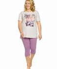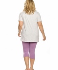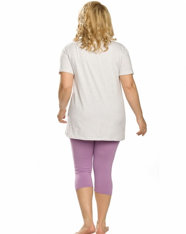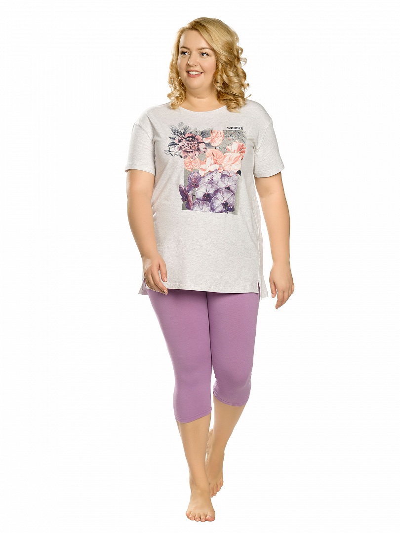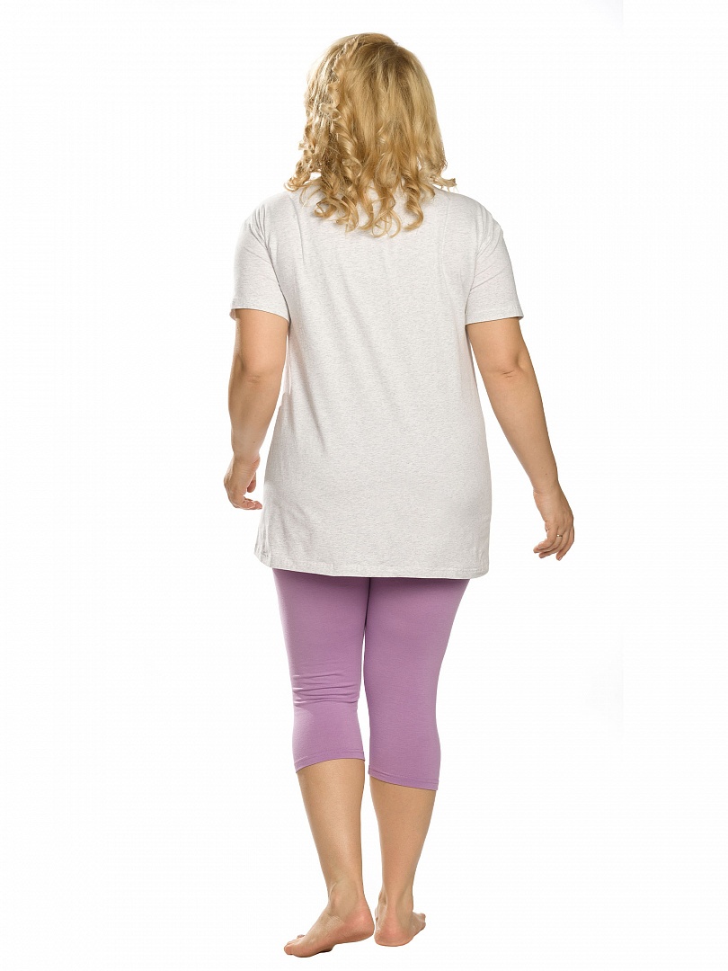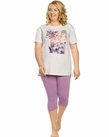 Комплект женский: туника и лосины. Туника комфортного объема из меланжа. Спущенное плечо, свободный рукав. Боковые швы переведены вперед, внизу - небольшие разрезы. Мягкий стойкий soft-принт. Перевод:"Чудо". Небольшой перепад длин переда и спинки. Лосины из приятного к телу трикотажа. Состав: верх: 95%хлопок 5%эластан, низ: 65%полиэстер 30%хлопок 5%эластан