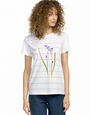 Футболка женская. Футболка прямого силуэта умеренного объема, втачной рукав. Аккуратный вырез горловины. Мягкий стойкий soft-принт. Перевод: "Красота начинается в тот момент, когда ты решаешь быть собой". Состав: 95%хлопок 5%эластан