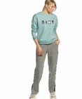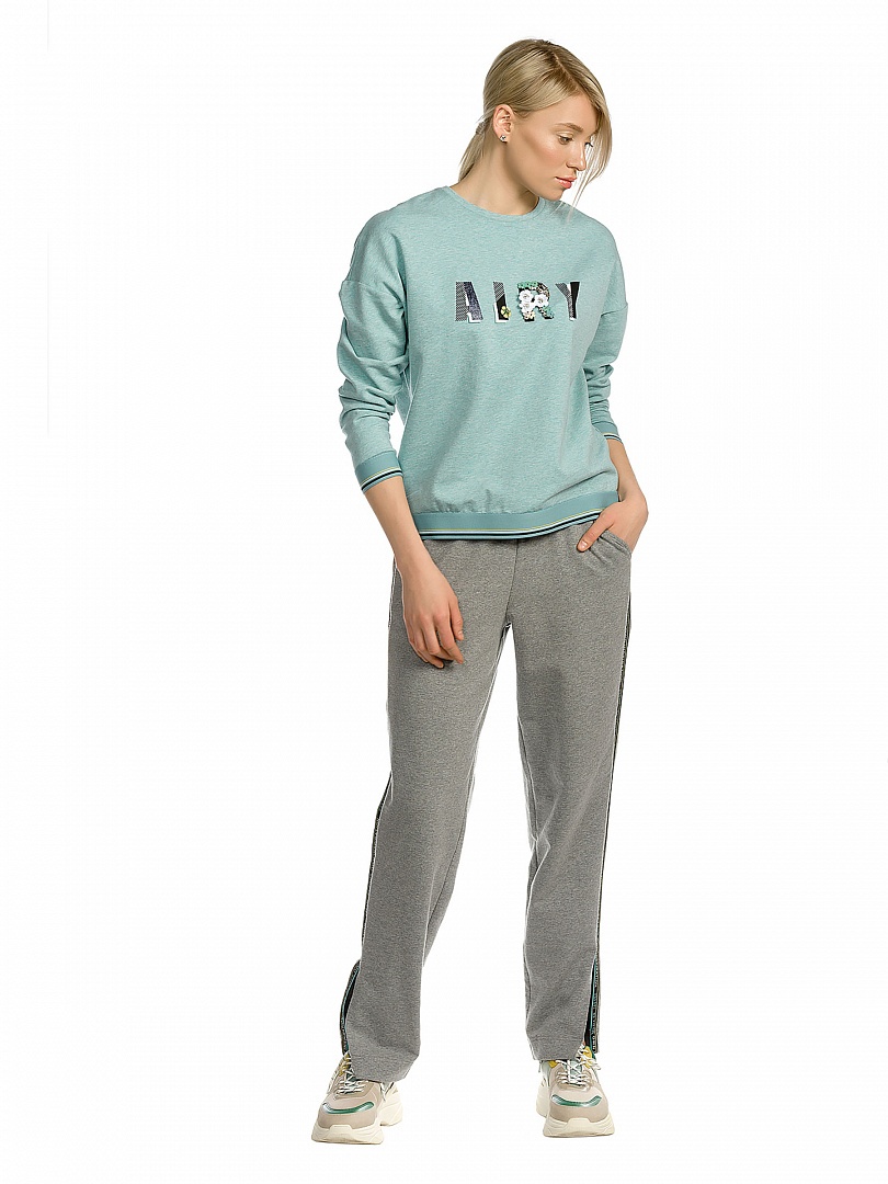 Комплект женский: толстовка и брюки. НОВИНКА! Свитшот комфортного объема. Фактурный шрифтовой принт с объемным декором и металлизированной посыпкой. Перевод: "Воздушная". По низу рукавов пришиты манжеты из рибаны с полосками. Трикотажные брюки нового современного кроя, карманы в боковых швах. Брюки-трубы, небольшого объема с разрезами сбоку и декоративной тесьмой по боковому шву. Состав: верх: 96%хлопок 4%эластан, низ: 96%хлопок 4%эластан
