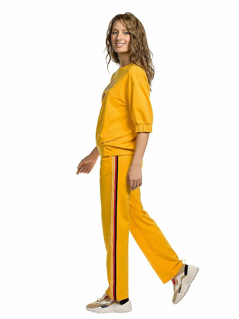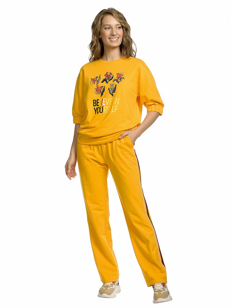 Комплект женский: толстовка и брюки. НОВИНКА! Футер в комбинации с тонким трикотажем на манжетах рукавов. Крупные сборки на манжетах - благодаря широкой внутренней резинке. Стойкий эластичный принт. Перевод: "Верь в себя. Будь собой". Брюки с карманами, прямые от бедра. Лампасы из репсовой ленты. Состав: верх: 75%хлопок 20%полиэстер 5%эластан, вставка: 57%хлопок 38%полиэстер 5%эластан, низ: 75%хлопок 20%полиэстер 5%эластан