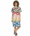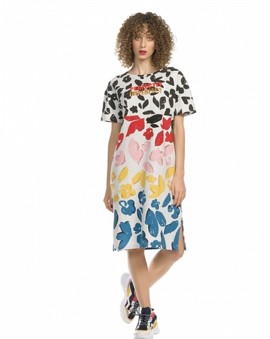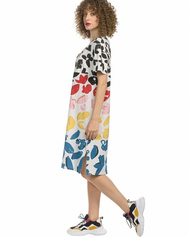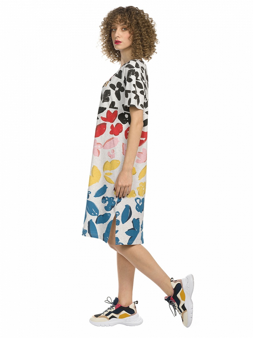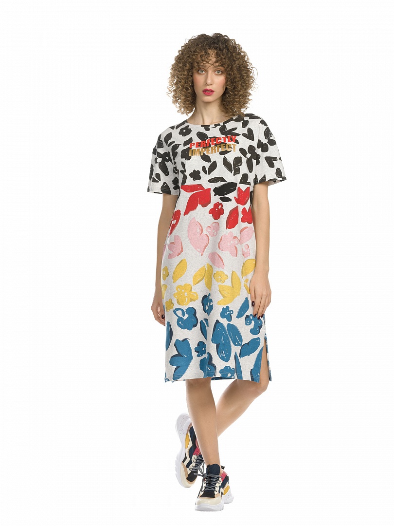 Платье женское. Платье-футболка современной длины миди прямого силуэта. Естественная линия плеча, мягкий спортивно-женственный объем. Отрезное выше талии. Мягкий стойкий soft-принт на светло-сером меланже. Шрифт выполнен золотом и красным глянцем. Перевод: "Прекрасно несовершенство". Состав: 95%хлопок 5%эластан