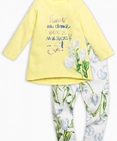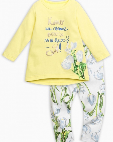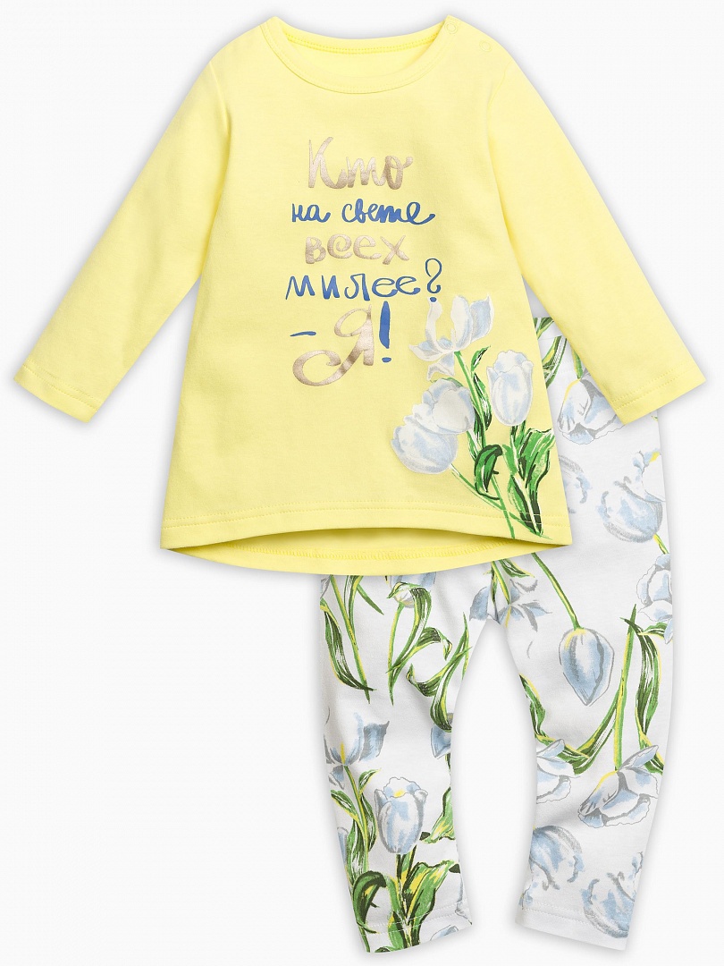Комплект для девочек: туника и лосины. Туника: перепад длин переда и спинки. Центральный принт с золотом: сочные тюльпаны и надпись "Кто на свете всех милее? -Я!". Лосины в all over принт с сочными тюльпанами. Состав: верх: 100%хлопок, низ: 100%хлопок