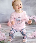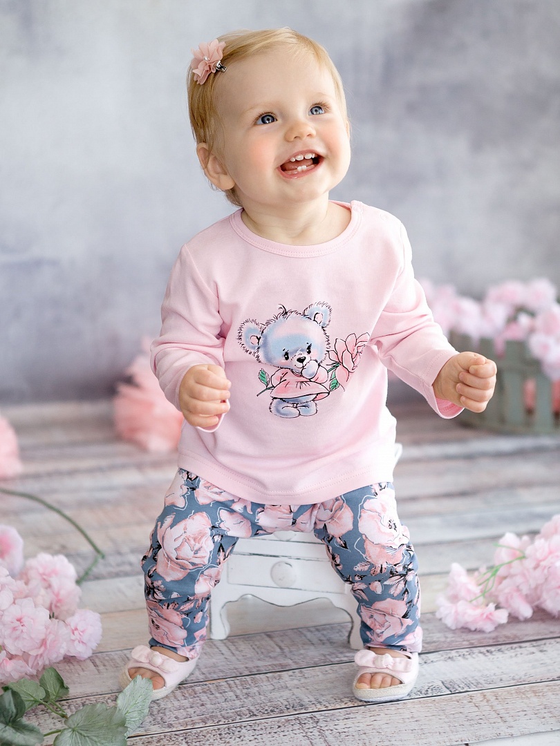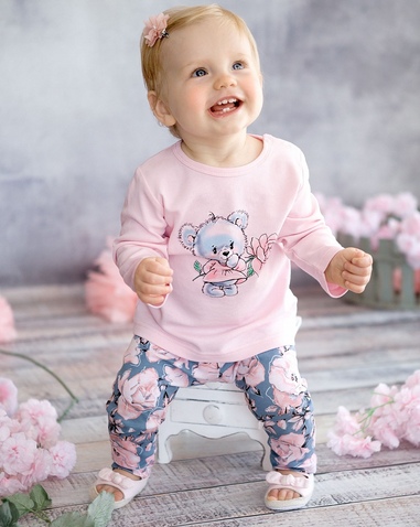 Комплект для девочек: туника и лосины. Свободная туника силуэта трапеция. Перепад длин переда и спинки. Центральный принт в виде милого медвежонка. На плече застёжка на две кнопки для удобства надевания. Классические лосины в all-over принт с нежными розами. Состав: верх: 100%хлопок, низ: 100%хлопок
