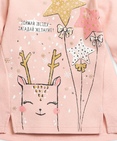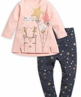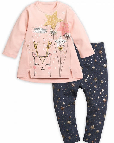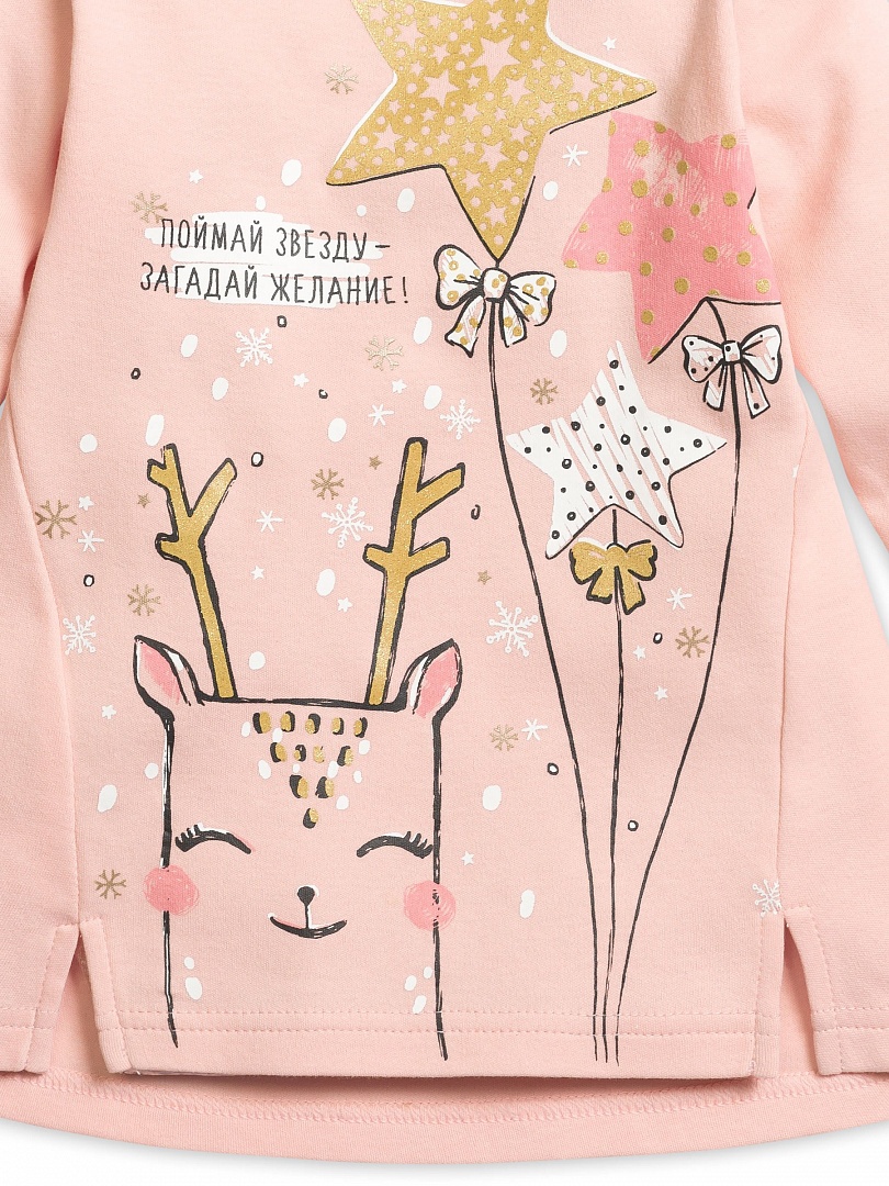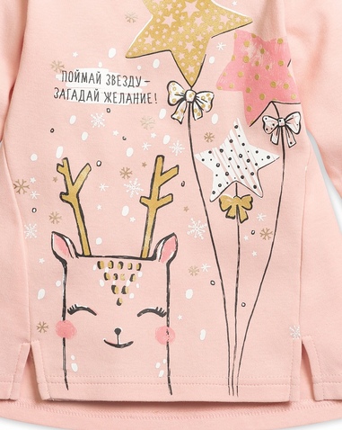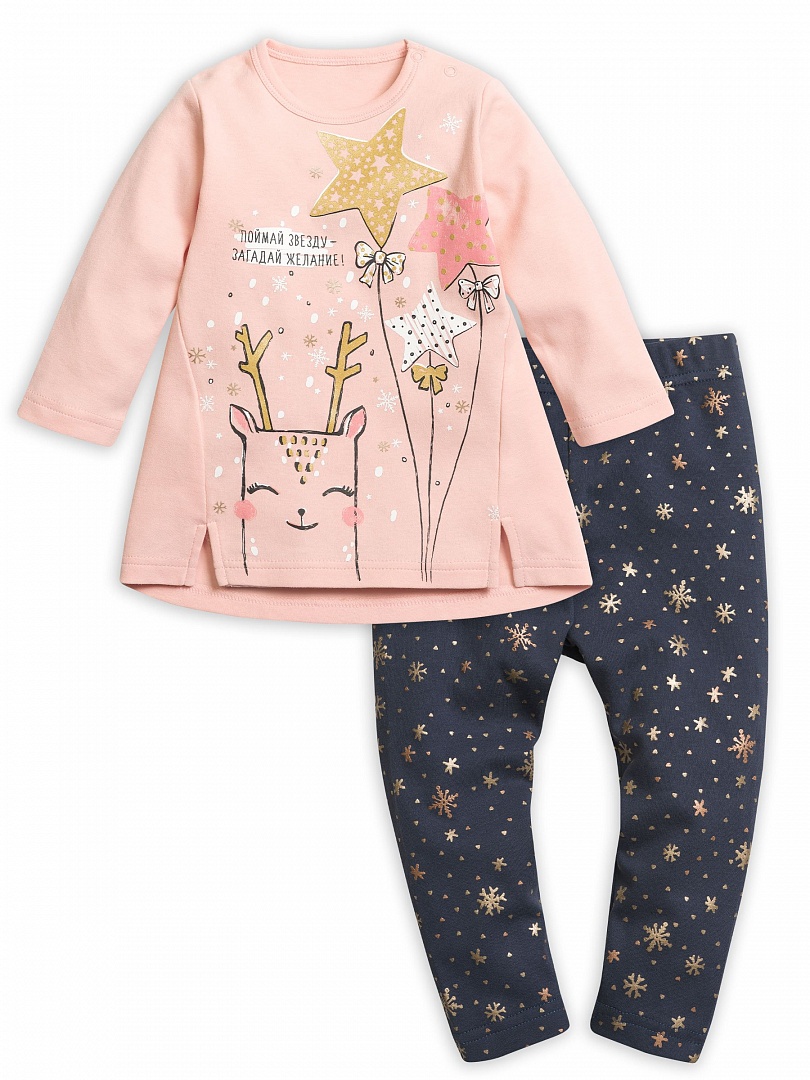 Комплект для девочек: туника и лосины. Туника нежного розового цвета. Центральный принт выполнен в необычной стилизованной графике, которую дополняет обилие золота. Надпись "Поймай звезду - загадай желание!" напоминает нам о новогодней сказке. Боковые швы переведены на перед и переходят в два аккуратных разреза по низу изделия. Застёжка на плече на две кнопки. Классические тёмно-серые лосины в мелкий принт снежинки из классического и розового золота. Состав: верх: 100%хлопок, низ: 100%хлопок