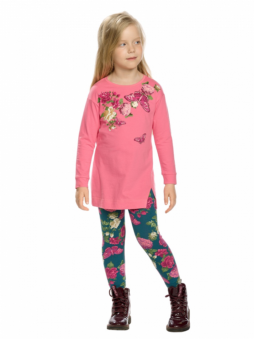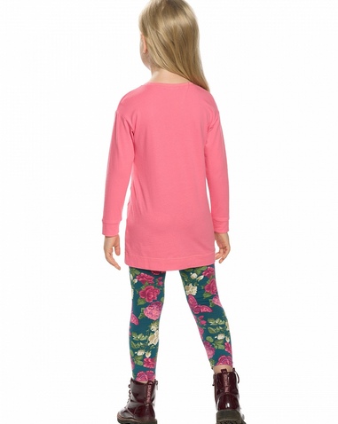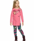 Комплект для девочек: туника и лосины. Туника со слегка спущенным плечом; по низу рукавов притачная манжета; декоративный шов с разрезом по переду изделия. Лосины в цветочный алловер принт. Состав: верх: 100%хлопок, низ: 95%хлопок 5%эластан