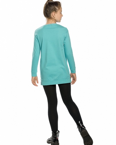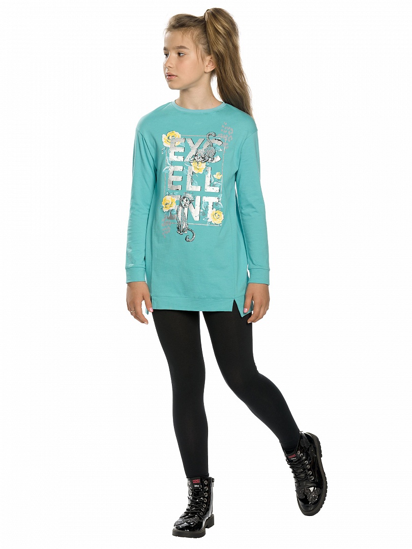 Комплект для девочек: туника и лосины. Туника прямого силуэта, слегка зауженная к низу; спинка ниже переда; боковые швы переведены на перед; по низу изделия притачные детали разной ширины, которые образуют разрезы на уровне рельефов переда; центральный принт в сочетании двух блесков: гладкого и фактурного в виде посыпок с надписью "Превосходный". Классические однотонные лосины. Состав: верх: 100%хлопок, низ: 95%хлопок 5%эластан
