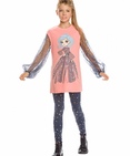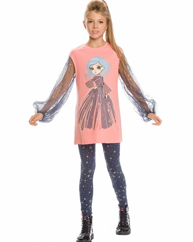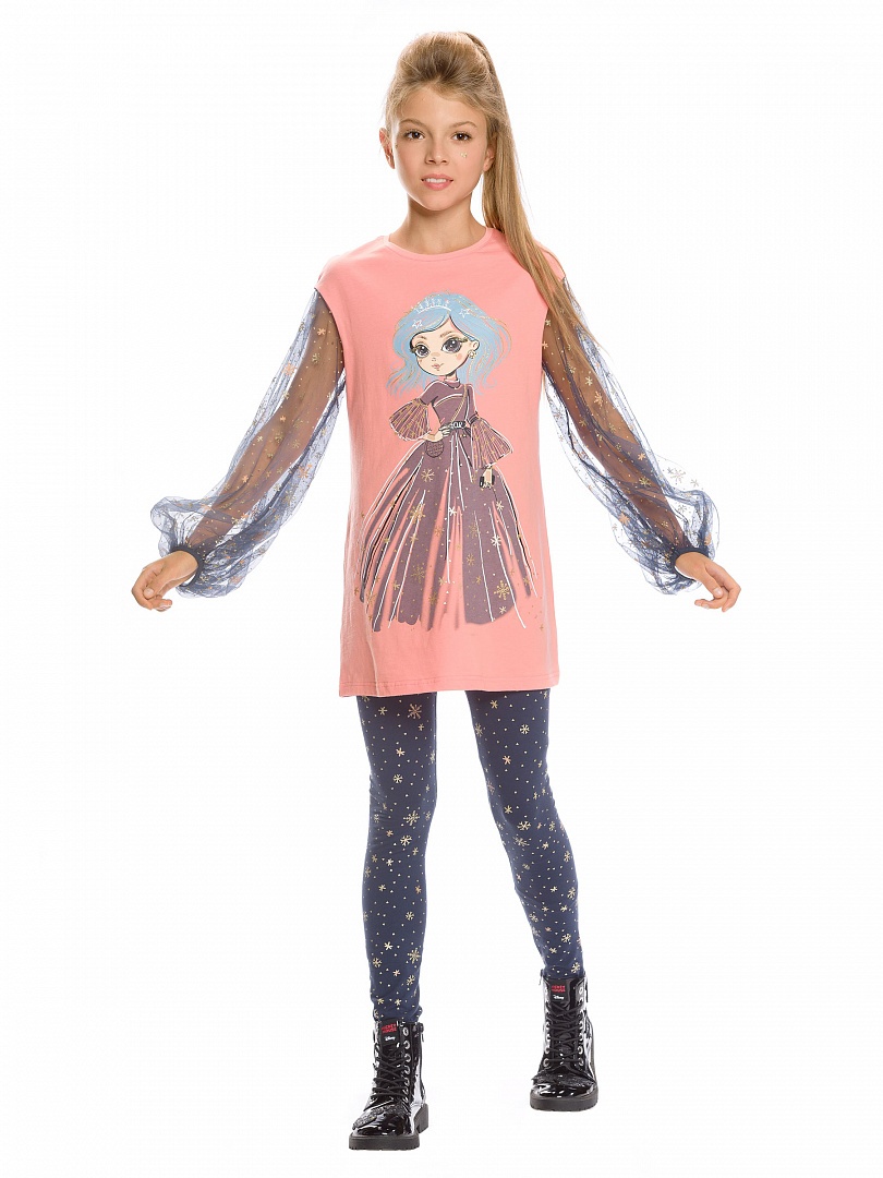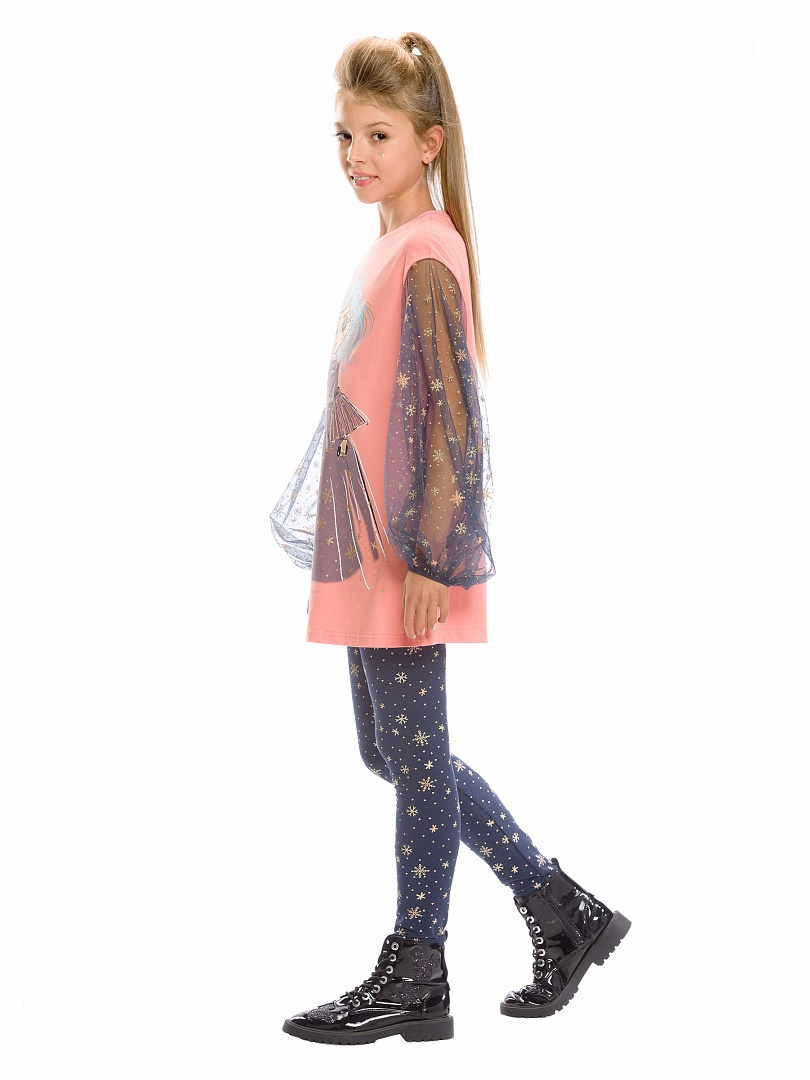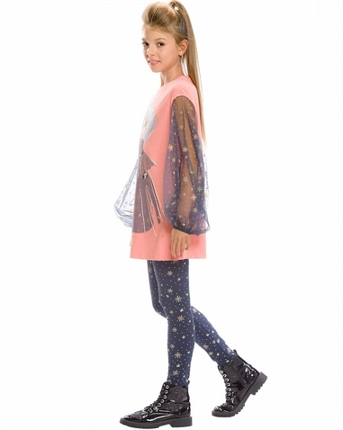 Комплект для девочек: туника и лосины. Нарядная туника со спущенным плечом и объёмными рукавами из принтованной декоративной сетки с золотым блеском. Для комфорта в носке внутренняя окантовка проймы выполнена из хлопка, по низу рукавов эластичная тесьма. Центральный принт с золотом в виде снежной принцессы. По рукавам принт с золотым блеском. Классические лосины с принтом в виде золотых снежинок. Состав: верх: 100%хлопок, вставка: 100%полиэстер, низ: 95%хлопок 5%эластан