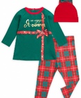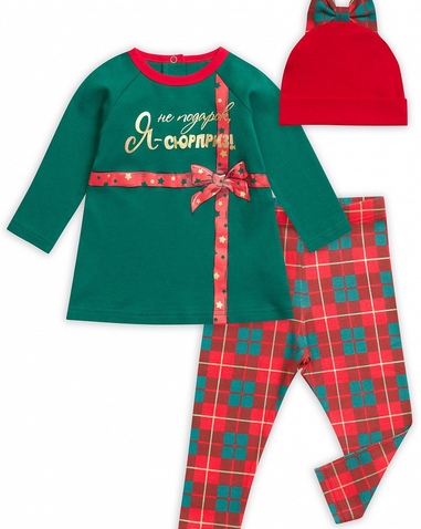 Комплект для девочек: туника и брюки. Туника имитирует подарочную упаковку, центральный принт с золотом: праздничная лента-бантик и надпись "Я не подарок, я - сюрприз!". Брюки в зелёно-красную клетку тартан. Комплект дополнен шапочкой, декорированной аккуратным бантиком. Состав: верх: 100%хлопок, верх2: 100%хлопок, низ: 100%хлопок