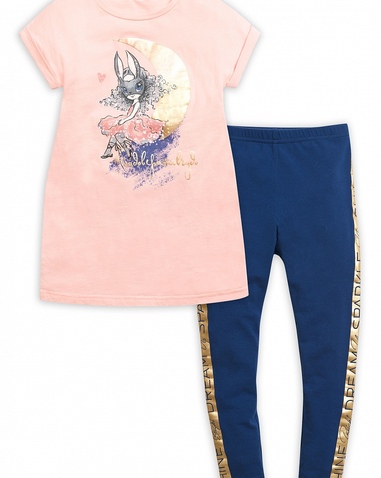 Комплект для девочек: туника и брюки. Туника: силуэт небольшая трапеция, рукав цельнокроенный, прочный Soft-принт c мерцающим золотом. Лосины: тонкий стрейч, талия на комфортной внутренней резинке (ширина 2.5 см), мягкий прочный SOFT-принт золотом - имитация лампасов. Состав: верх: 100%хлопок, низ: 93%хлопок 7%эластан