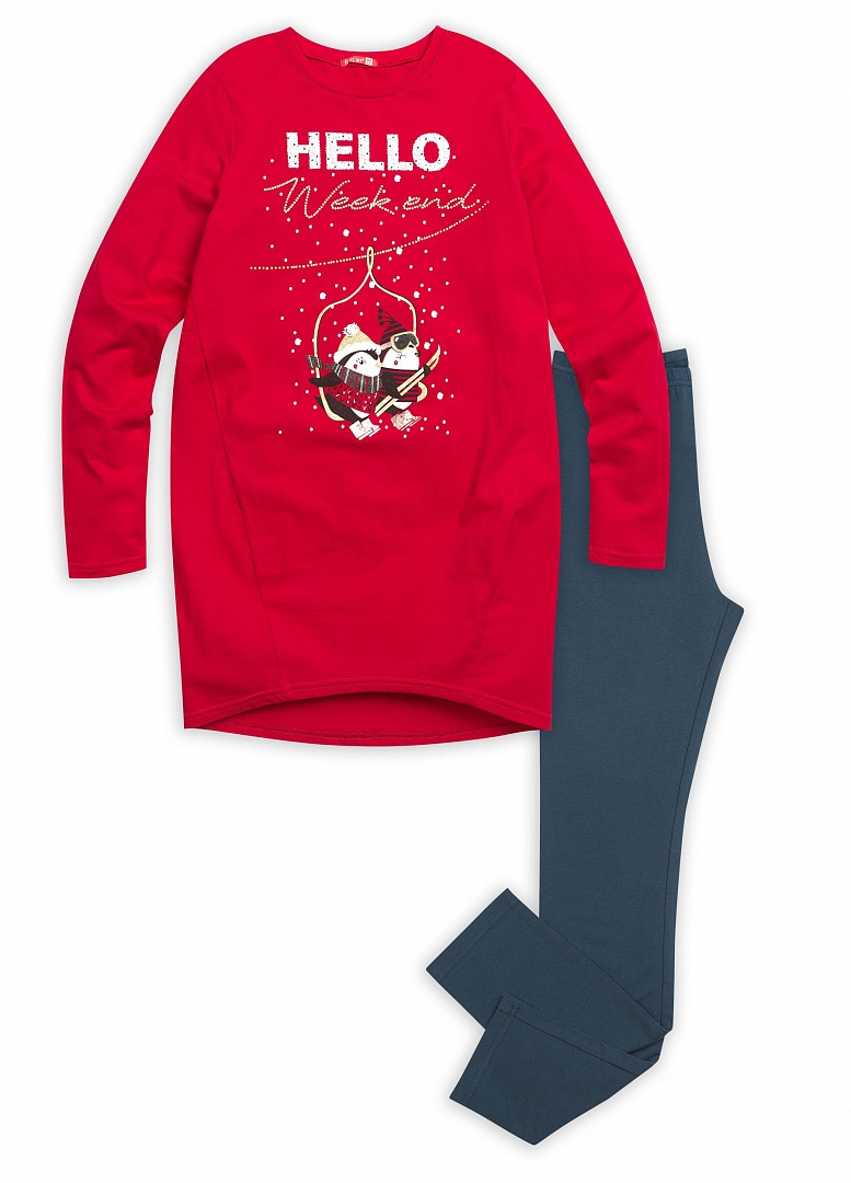Комплект для девочек: туника и лосины. Туника умеренного объема; низ изделия заужен, форма "бочонок", боковые швы переведены на перед; перепад длин переда и спинки; металлизированный принт с надписью " Здравствуйте# Выходные". Классические лосины. Состав: верх: 100%хлопок, низ: 95%хлопок 5%эластан