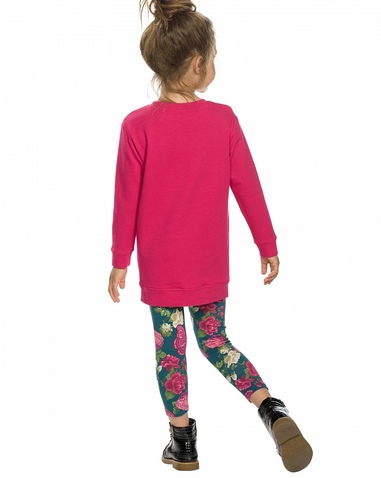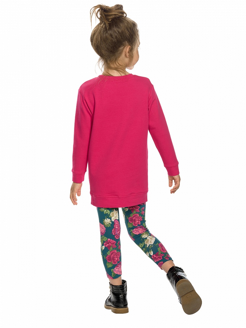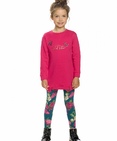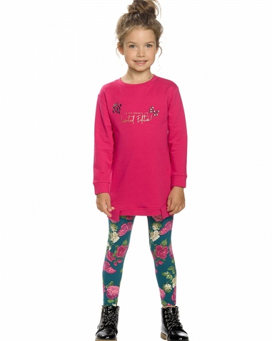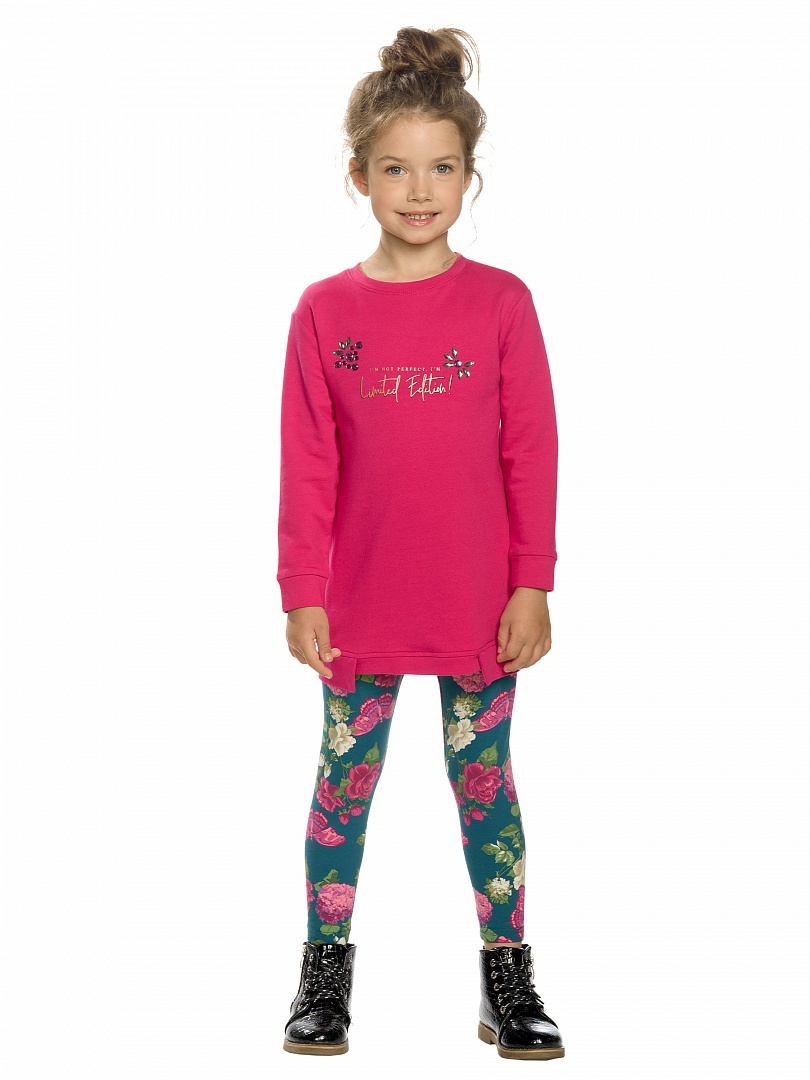 Комплект для девочек: туника и лосины. Утепленная туника из эластичного футера; слегка спущенное плечо; по низу рукавов и по низу изделия притачная манжета из основной ткани; аппликация из страз и надпись золотом "Я не совершенство, я лимитированного выпуска". Лосины из эластичного футера, увеличенной объемной формы, не стесняют движений, удобны в надевании. Цветочный алловер принт. Состав: верх: 96%хлопок 4%эластан, низ: 95%хлопок 5%эластан