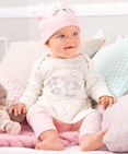 Комплект для девочек: боди и лосины. Боди с длинным рукавом, по линии талии широкая рюша, имитирующая юбочку. Центральный принт с золотом: милые мышата и надпись "Сладкие щёчки". Специальная форма выреза горловины позволяет легче и быстрее надевать полукомбинезон на малышку. Застёжка на кнопки по низу изделия. Классические лосины нежного розового цвета. Состав: верх: 100%хлопок, низ: 100%хлопок