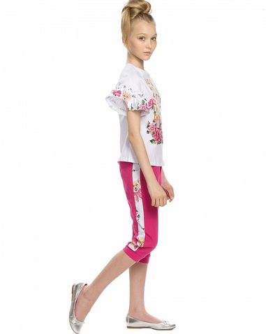 Комплект для девочек: футболка и бриджи. НОВИНКА КРОЯ! Футболка более свободного силуэта, со спущенным плечом и настрочной рюшей; перевод принта "Я не хочу ничего решать, я хочу платье". Бриджи с регулировкой объёма по талии внутренним шнурком; по бокам изделия декоративный лампас Состав: верх: 100%хлопок, низ: 60%хлопок 40%полиэстер