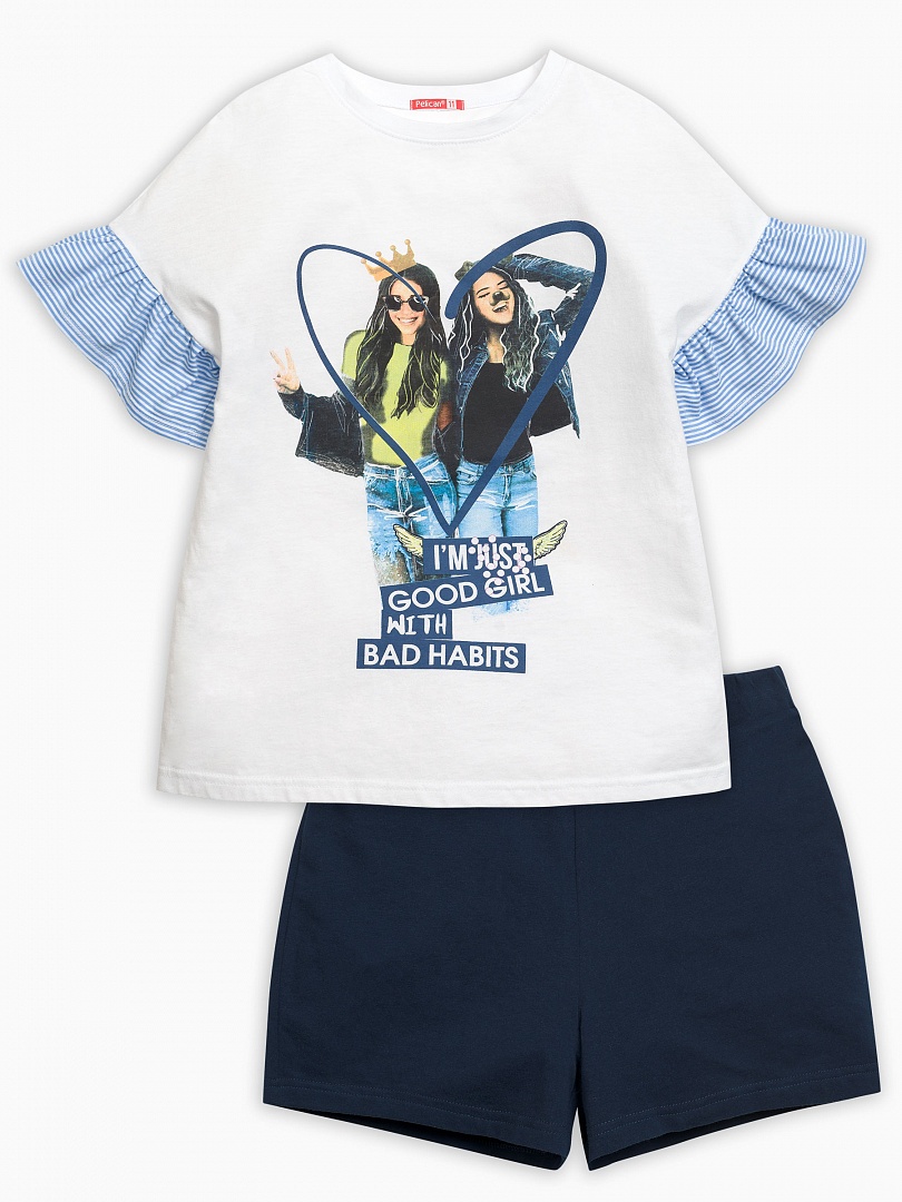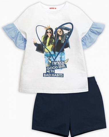 Комплект для девочек: футболка и шорты. Новый трикотаж, мягкий и пластичный. Свободный силуэт, рукав цельнокроенный, с воланом. Стойкий мягкий soft-принт, не резиновый, перевод "Я просто хорошая девочка с плохим манерами". Шорты среднего объема, в поясе- внутренний шнурок. Состав: верх: 60%хлопок 40%полиэстер, низ: 95%хлопок 5%эластан